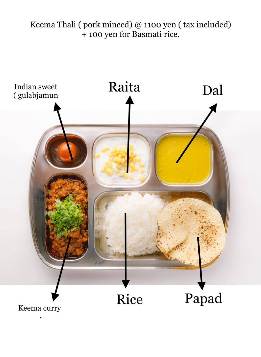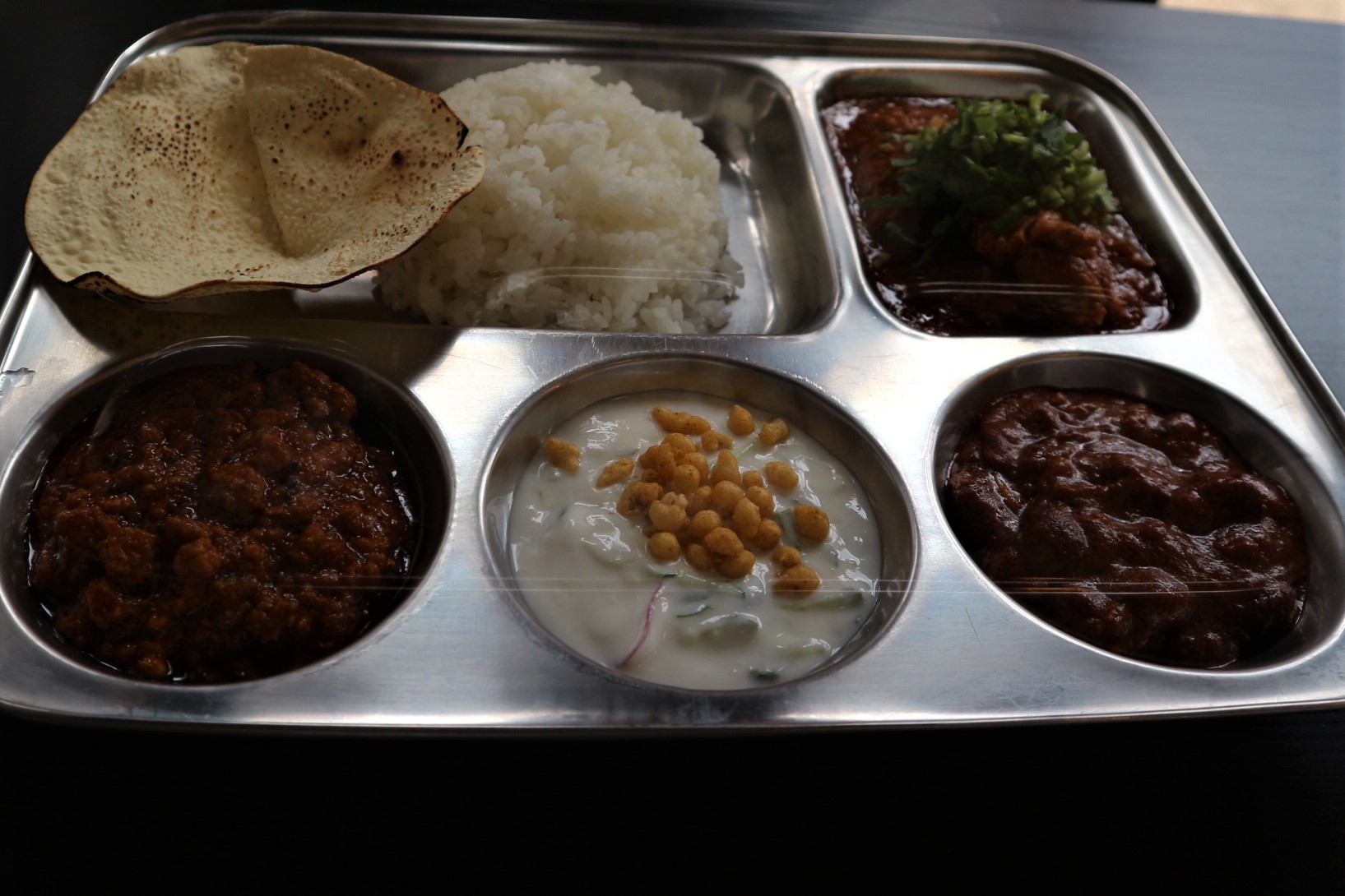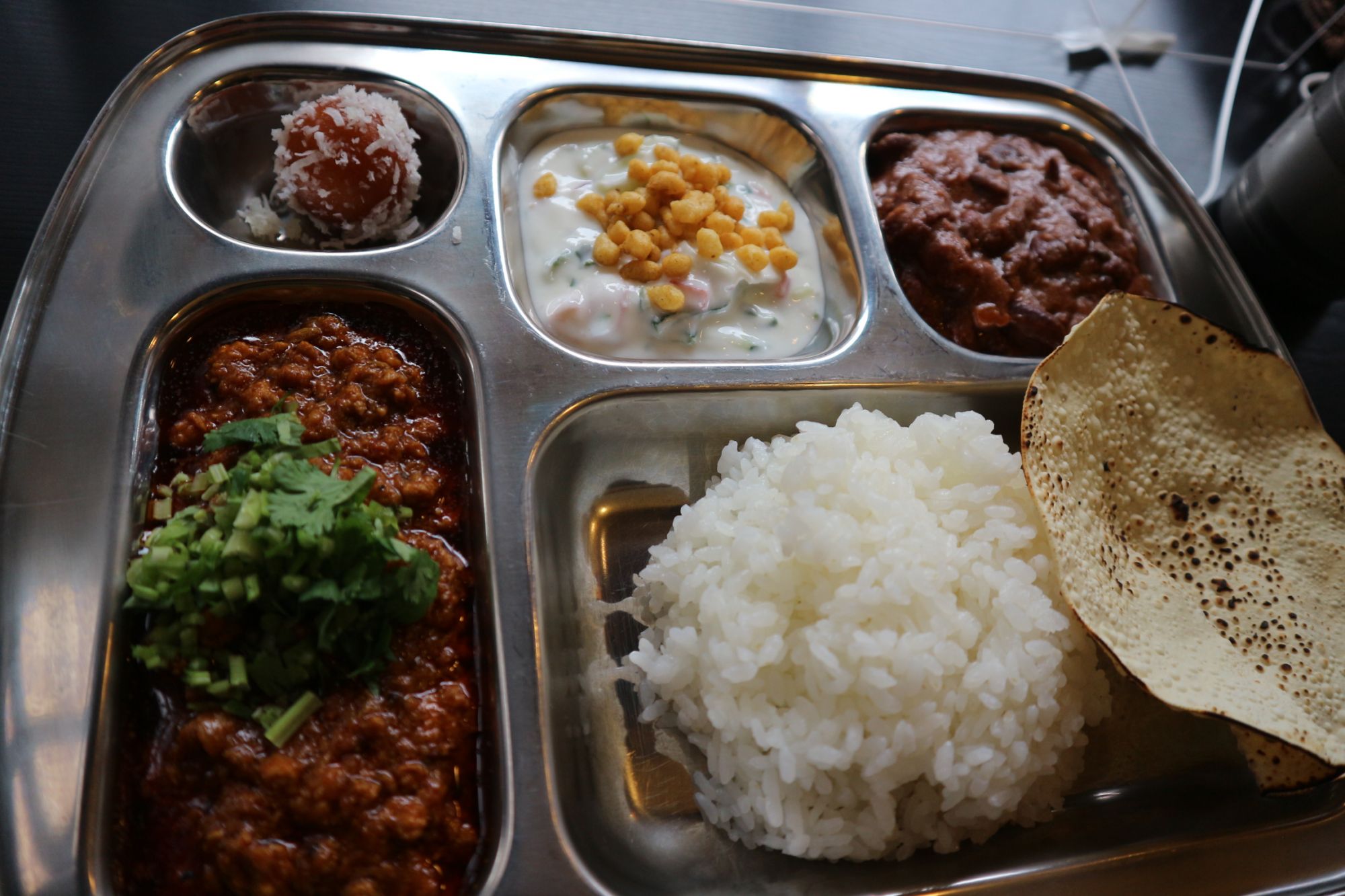 カレーは2種類あります。少し辛めのキーマカレー、優しい味の豆カレー、ご飯にパパド、ヨーグルト(ラッシー)は、カレーによく合います。デザートには香辛料が少し効いた甘いお菓子がとても美味しかったです。