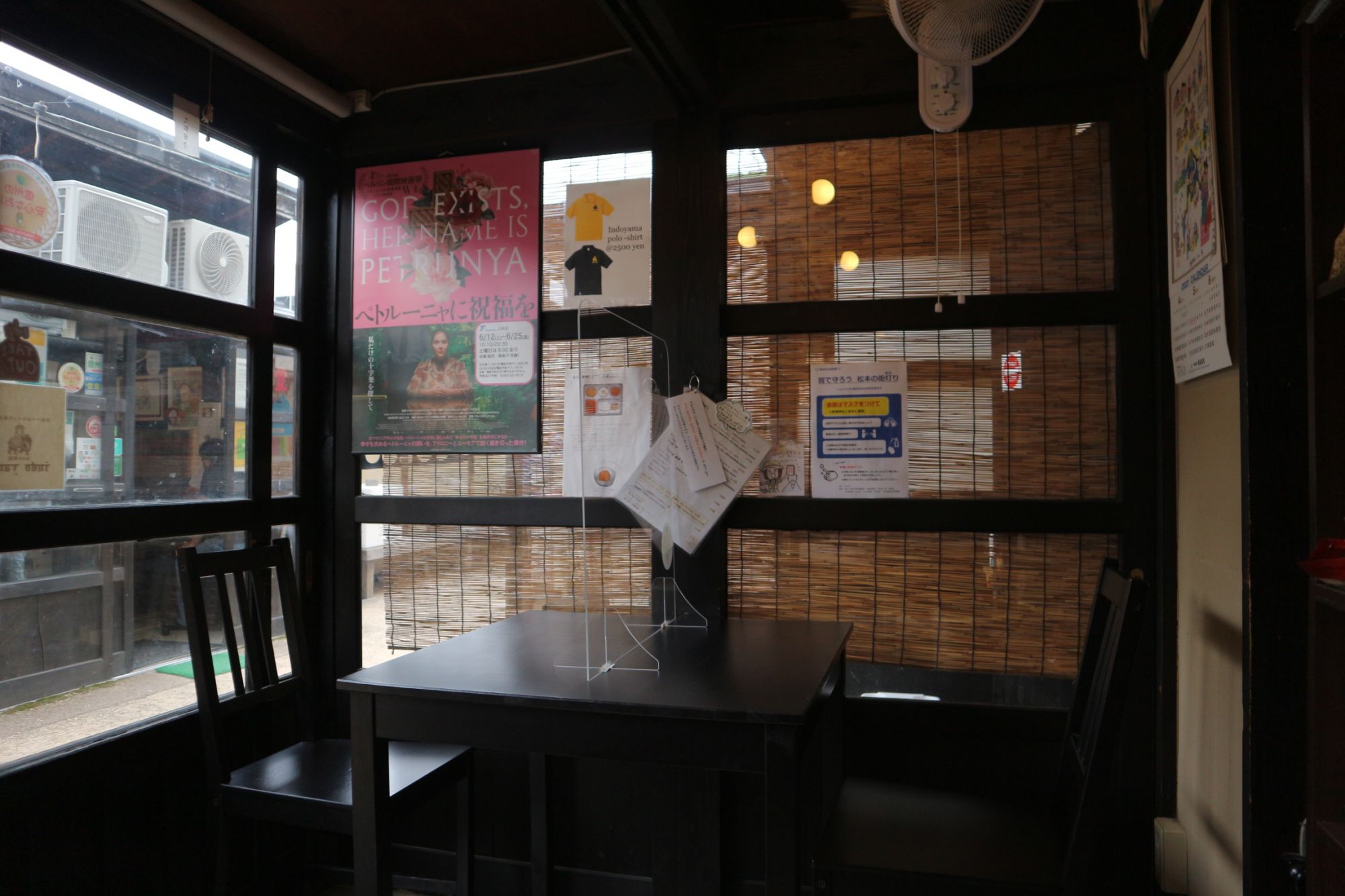 この店舗では、インド食材なども陳列されています。テーブルには、感染予防の為のアクリル板も設置されています。