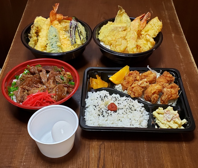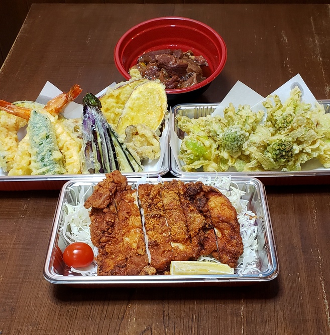 ☆鳥から弁当600円 ☆牛スジ丼600円 ☆天丼700円 ☆海鮮天丼950円 ☆こだわり弁当1000円~