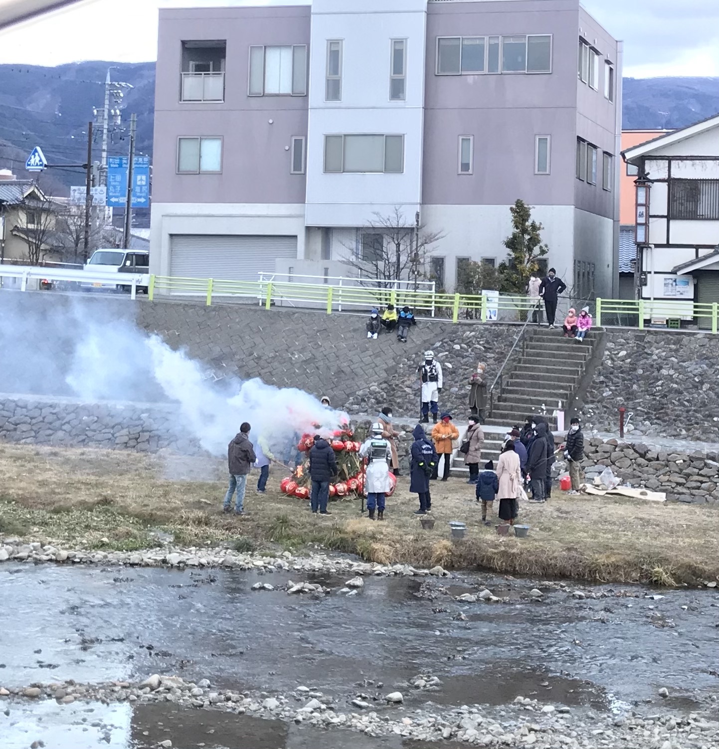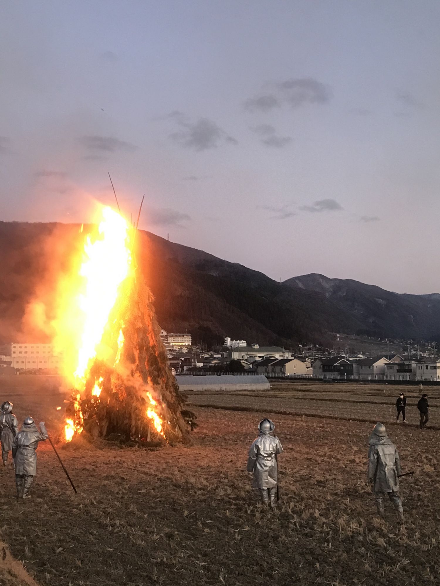 Из нескольких длинных балок сооружается высокий каркас, на который потом привязывают отслужившие свое сименыва , символы прошлого года и круглоглазых дарума. После того, как огонь утихнет, детвора (и не только) с радостью запекают над углями маюдама (небольшие шарики изготовление из рисовый муки с добавлением красителей и нанизанные на длинные ветки или прутья)