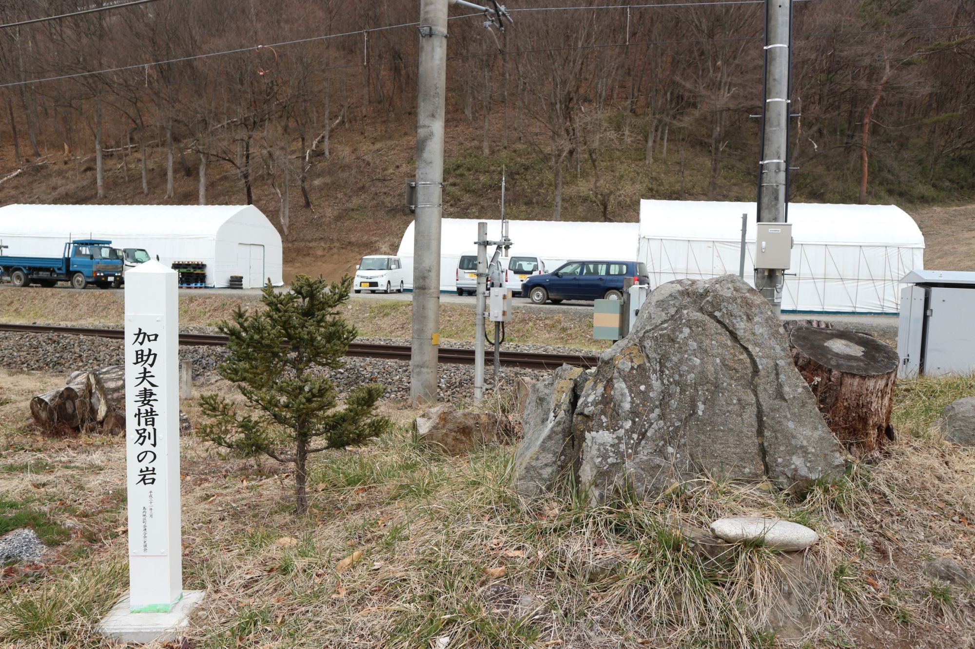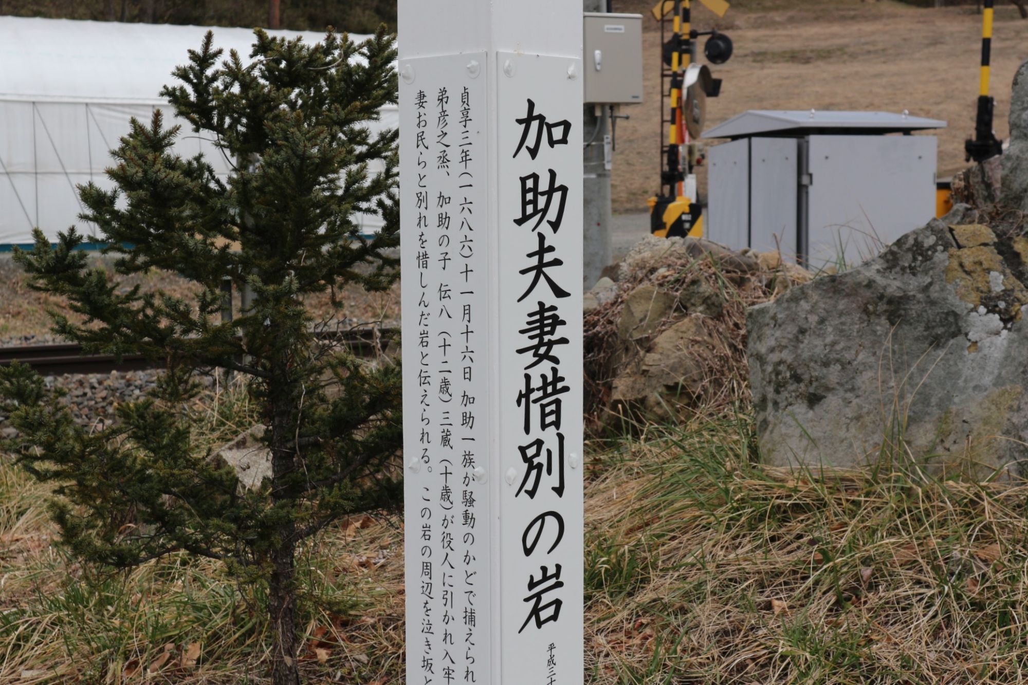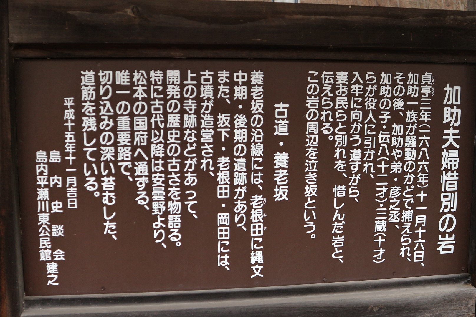 貞享3年(1686年)多田加助らを中心とする安曇・筑摩の農民一揆が起き、その首謀者として囚われの身となった加助が、刑場への途中この岩で夫婦が別れを惜しんだと言われています。