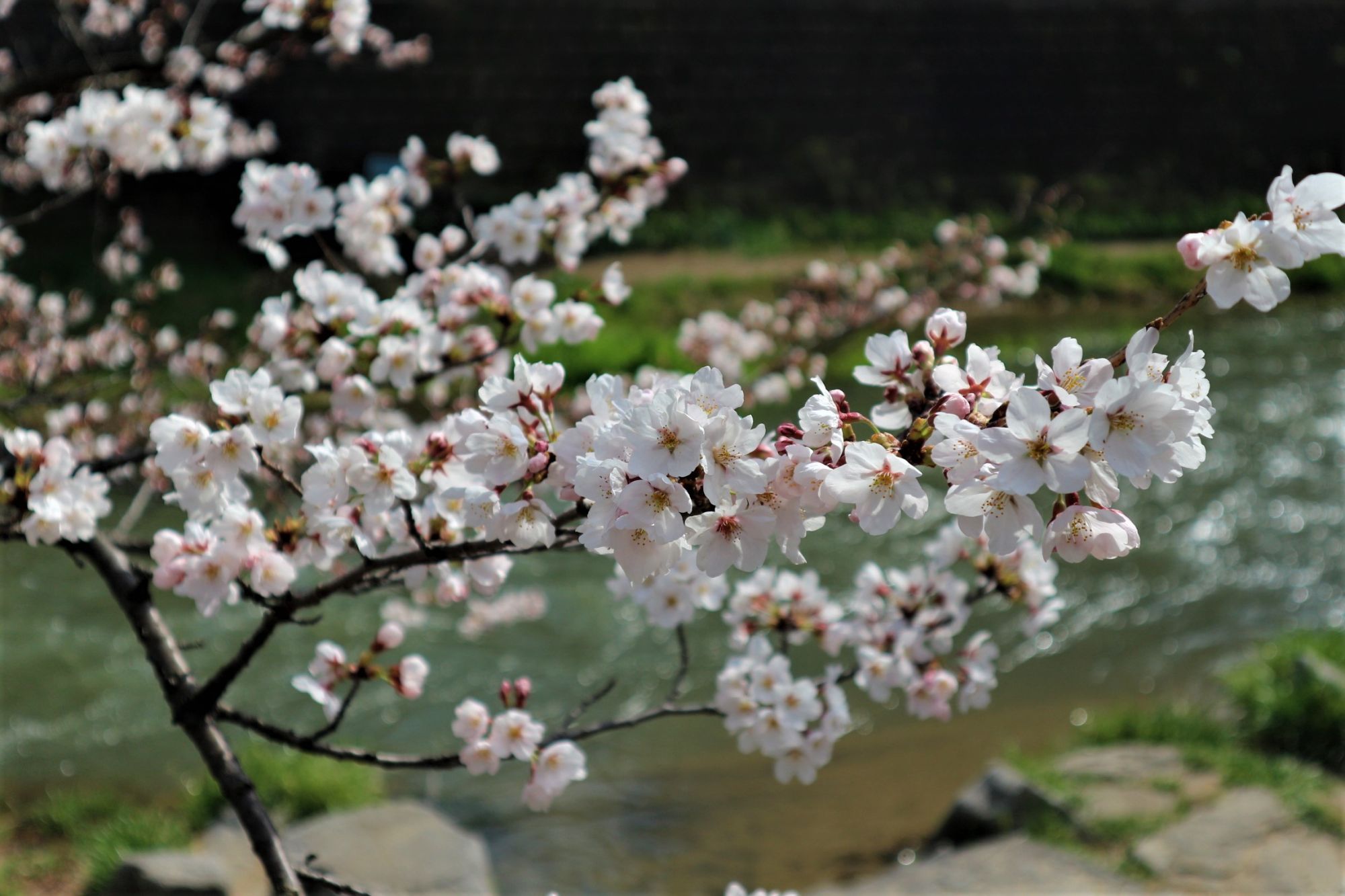 女鳥羽川の水辺のソメイヨシノは、まだつぼみは沢山ありますが、咲いた桜は五分咲き