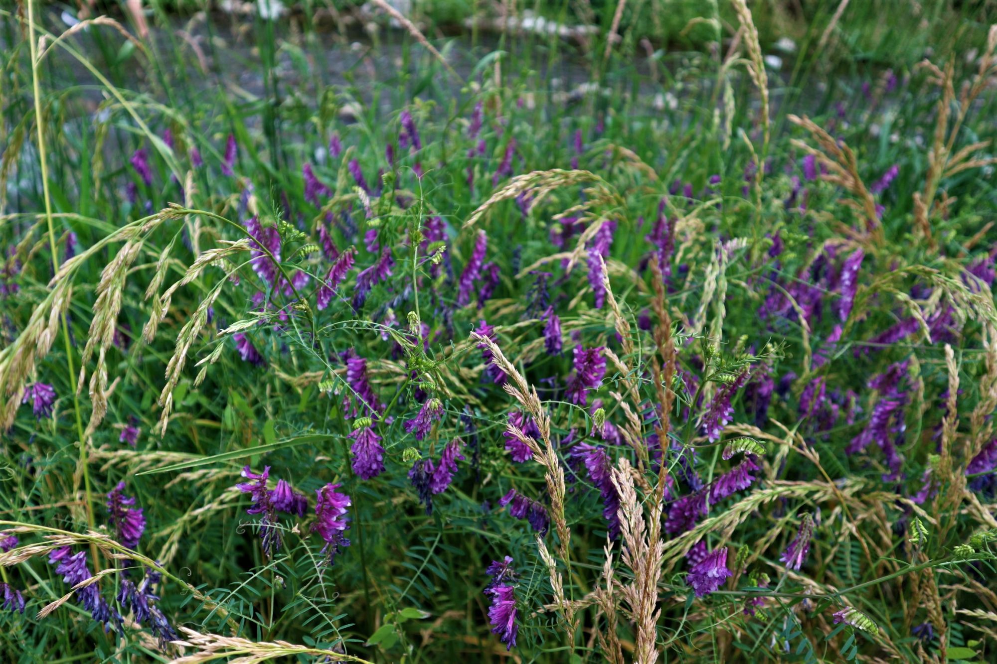左の花3は、この数年でかなり増殖している 草刈り厄介で手を焼いている「ナヨクサフジ」です。