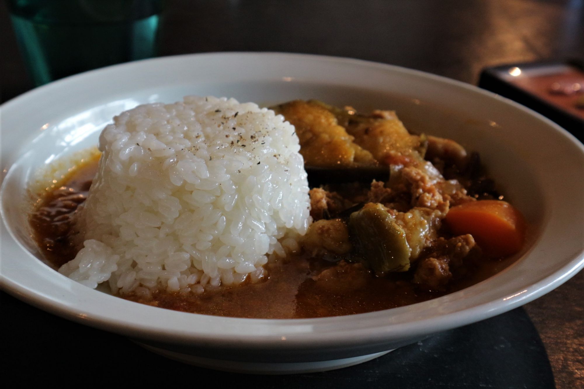 大きな茄子が入ったスパイシーなカレーです。美味しいよ。