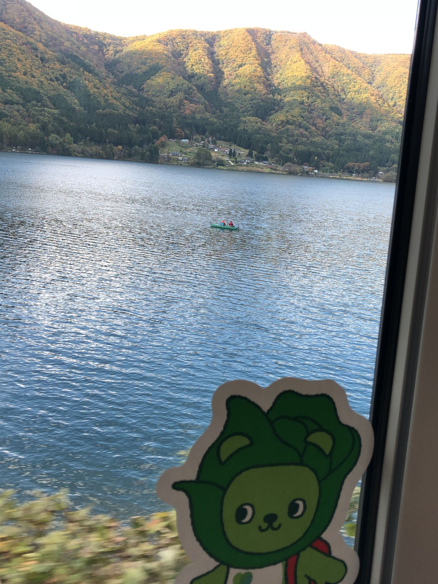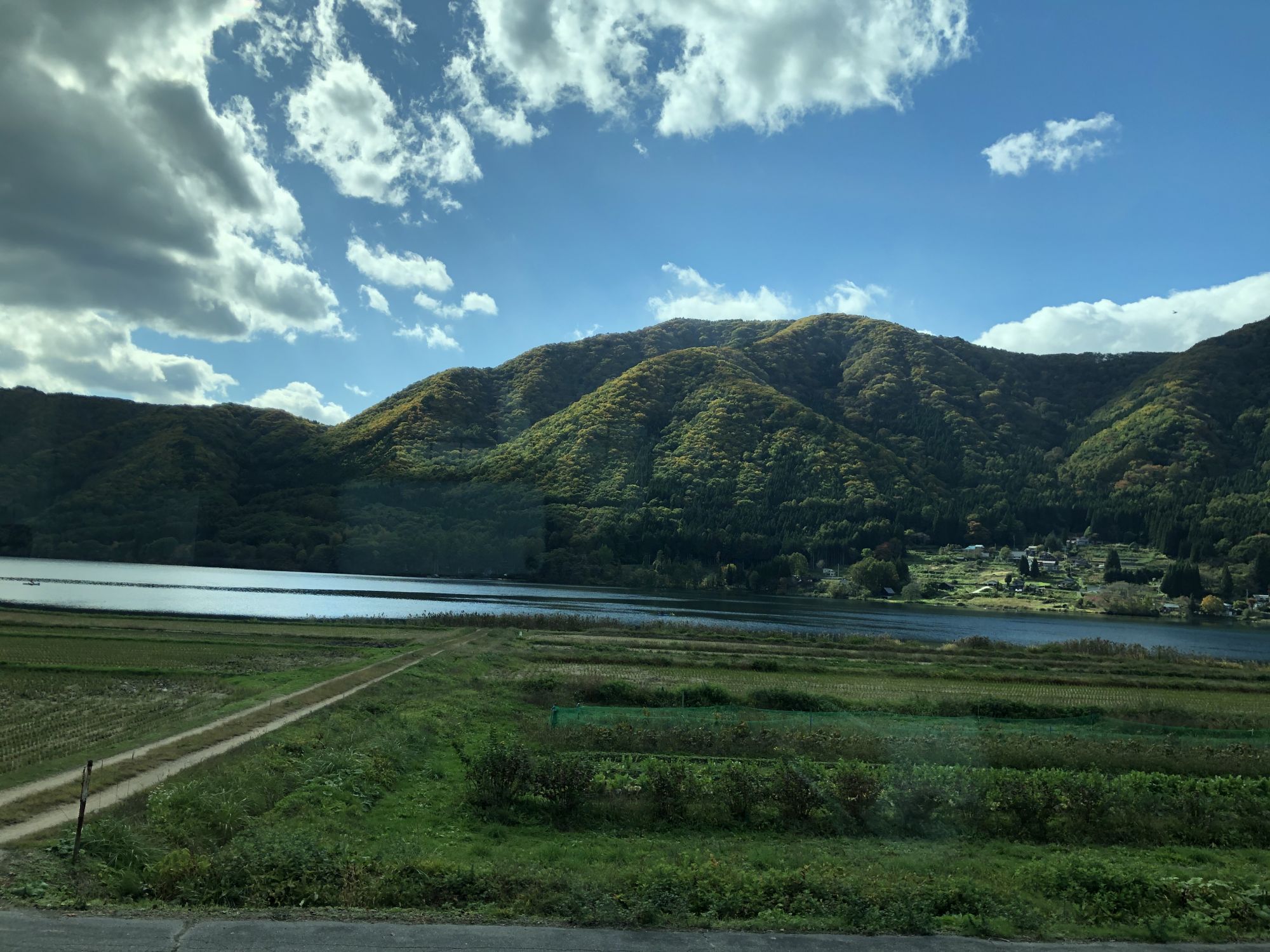 从车窗向外望去,沿着奥尔匹斯山脚下,一片田园风光,还有几处天然湖。边听着车厢内解说员的介绍,拍了几张照片,一会儿就到了第二站“大町站”。