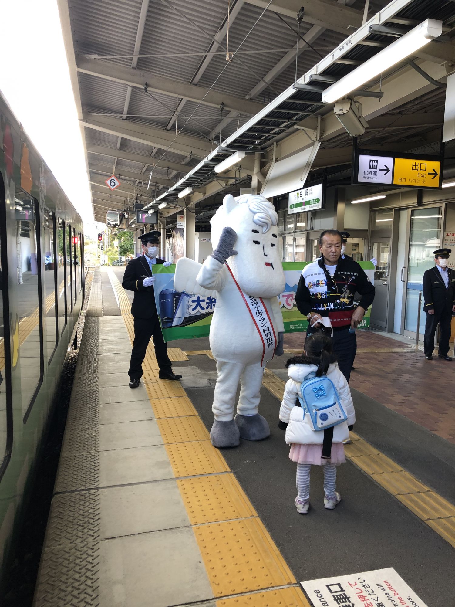 到了我们这次的目的地“白马站”,一下车,迎面有位不速之客前来迎接;白马村的吉祥物“村男三世”!不是常有的什么小动物之类的,而是全身白的不苟言笑的老村民。后来听说那张脸长得和真村长一模一样!