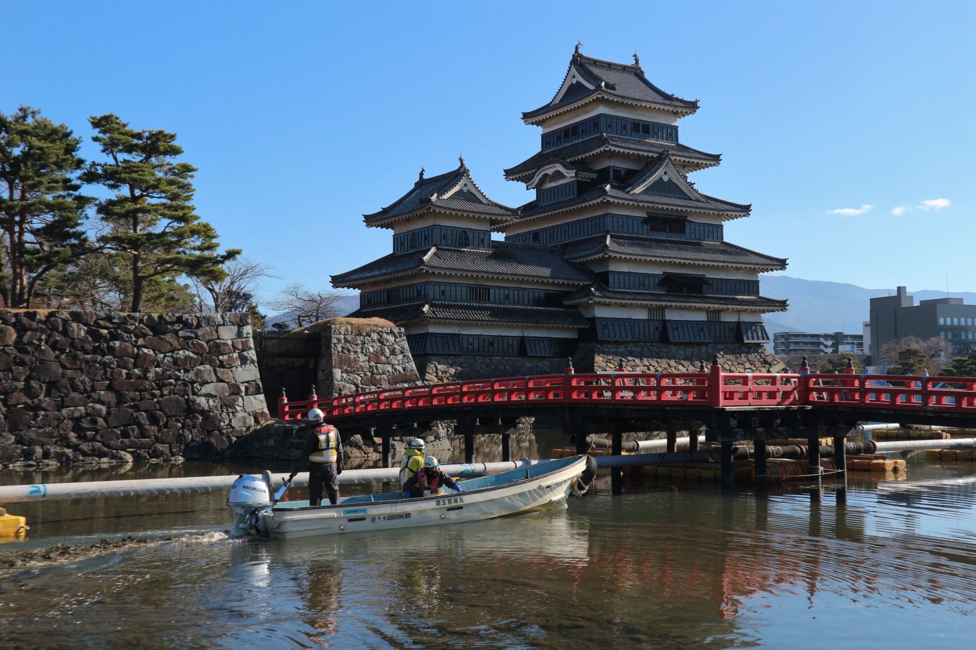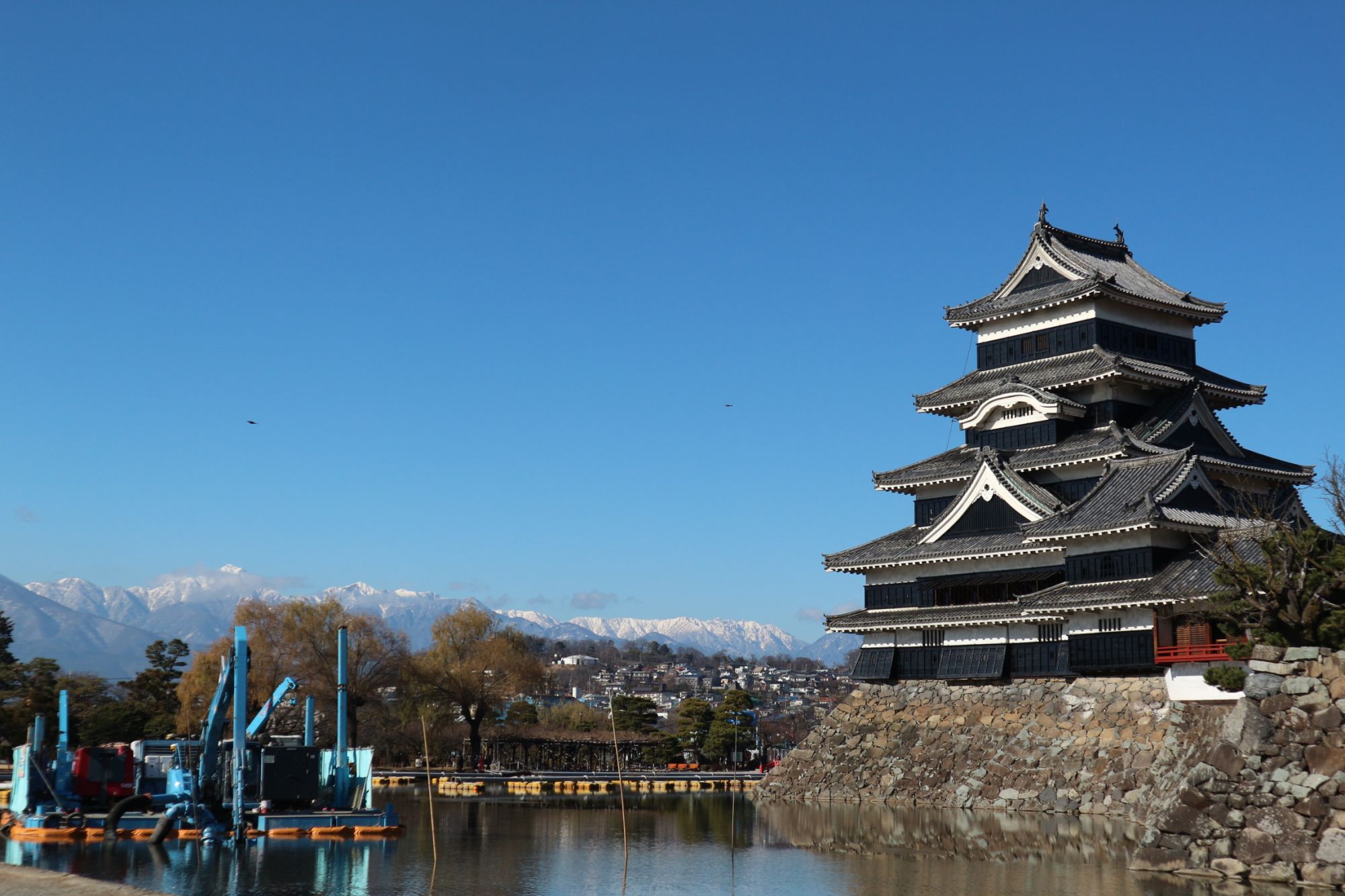 冬の松本城周辺 堀の浚渫(しゅんせつ)実施中