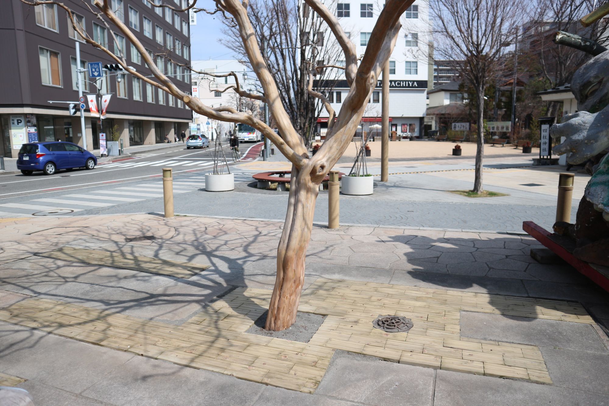 百日紅の地面の周りには、くつろぎの場をわかりやすく表現する木製インターロッキングブロックが施されています。いい感じです。