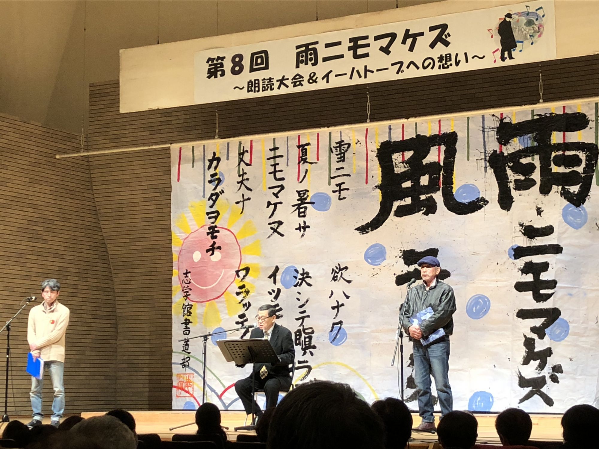 前不久,疫情还刚开始时,参加了一个独特的诗歌朗读会,年年不同年龄、不同职业的人纷纷登台,以各种形式朗颂同一首日本家喻户晓的诗—宮澤賢治:”風雨無阻“(雨にも負けず),很感人。在风雨交加之际,我们每个人应以怎样的心态去面对,从这位百年前的诗人的诗句里,能得到不少的启示。网上查了一下,有不少种中文译法,不妨挑了一首,如下。也为自勉。日文原文附在照片后,作参照。