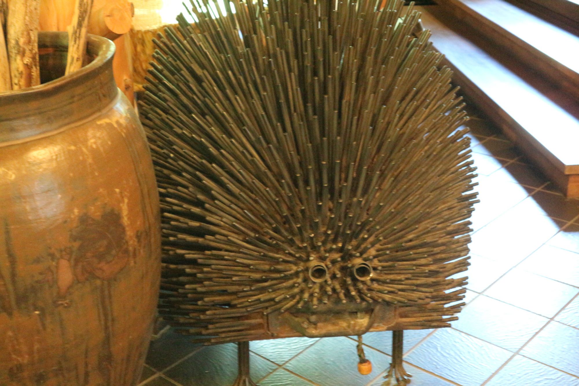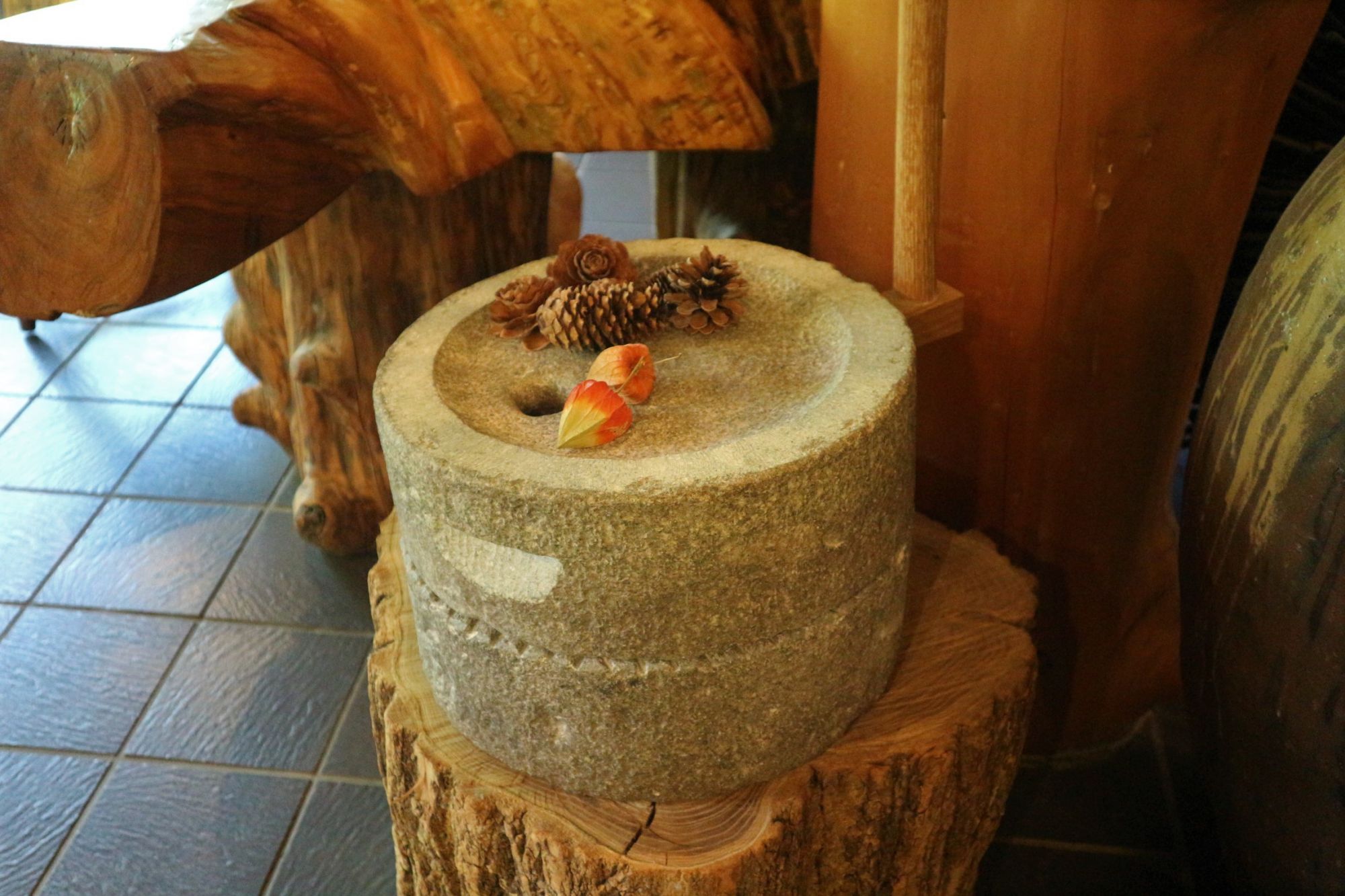 広い店内に石臼・ストーブ・カマなどが置かれています。