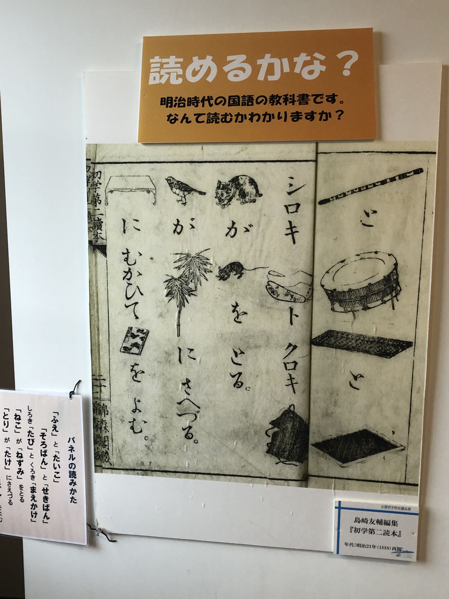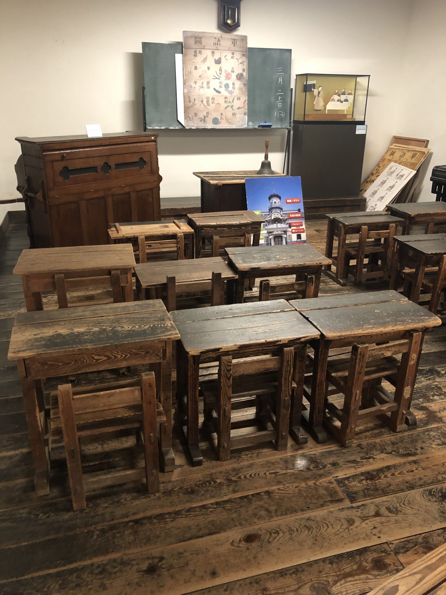 当时用的课本、书桌。令人吃惊的是,一百五十年前,同一教室的书桌高矮就不一,考虑到孩子们的不同身高!
