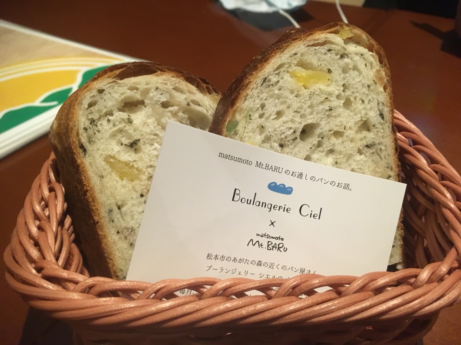 あがたの森近くの「ブーランジェリーシエル」さんのパンがお通しです。