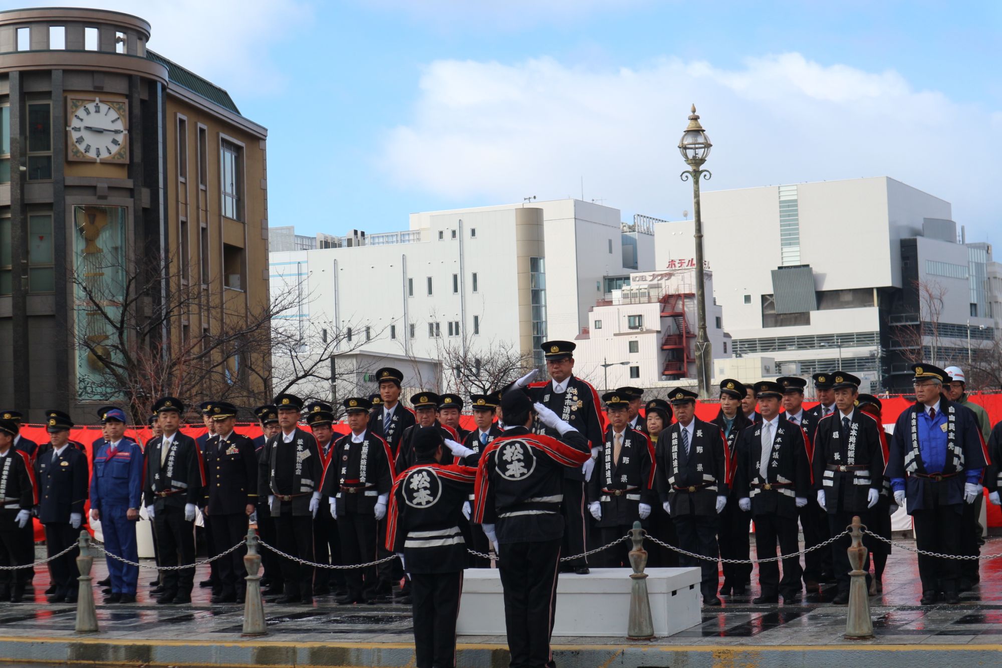 松本市中心市街地を流れる女鳥羽川にかかる千歳橋では、毎年1月5日に「出初式」が行われます。