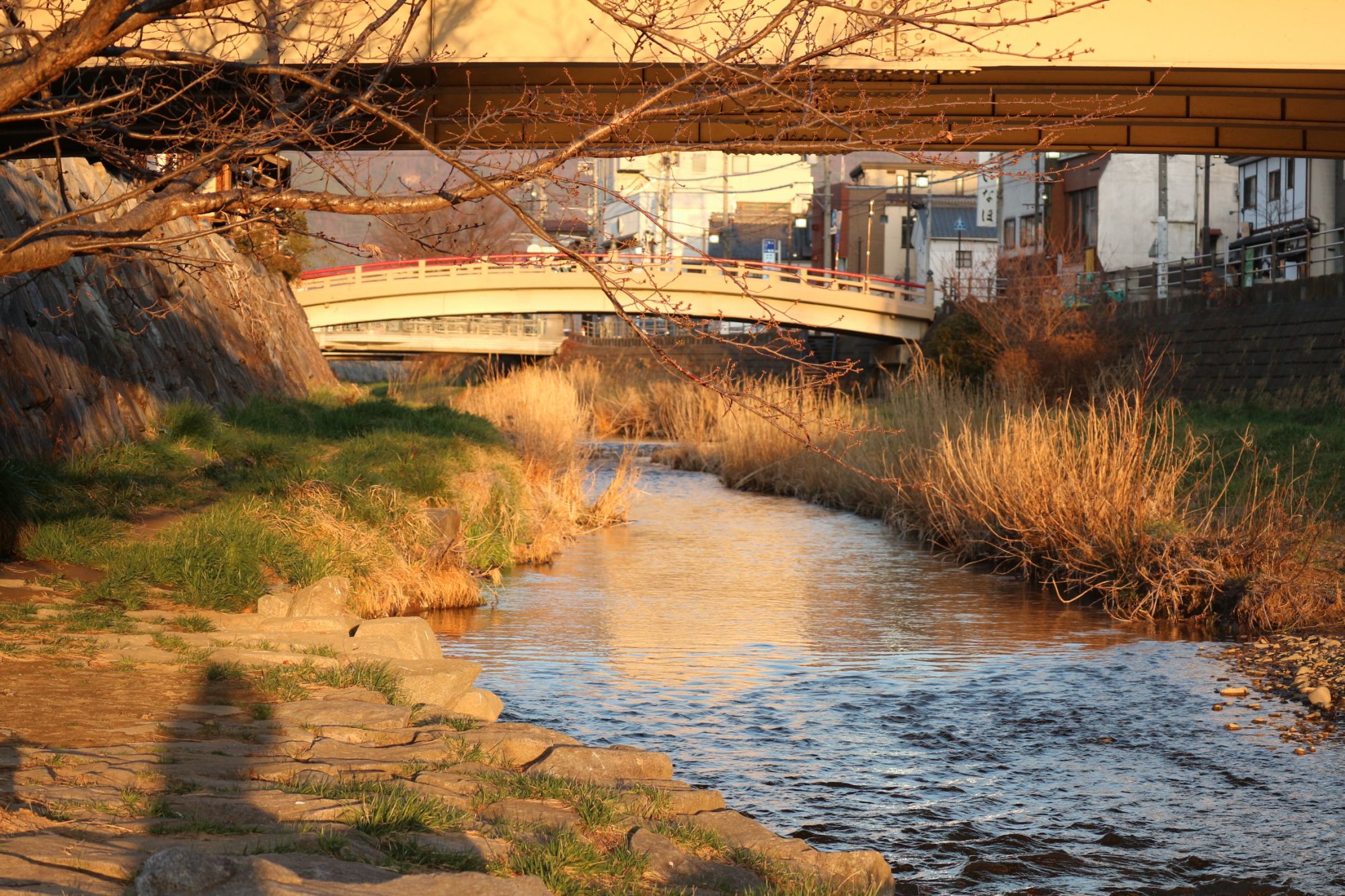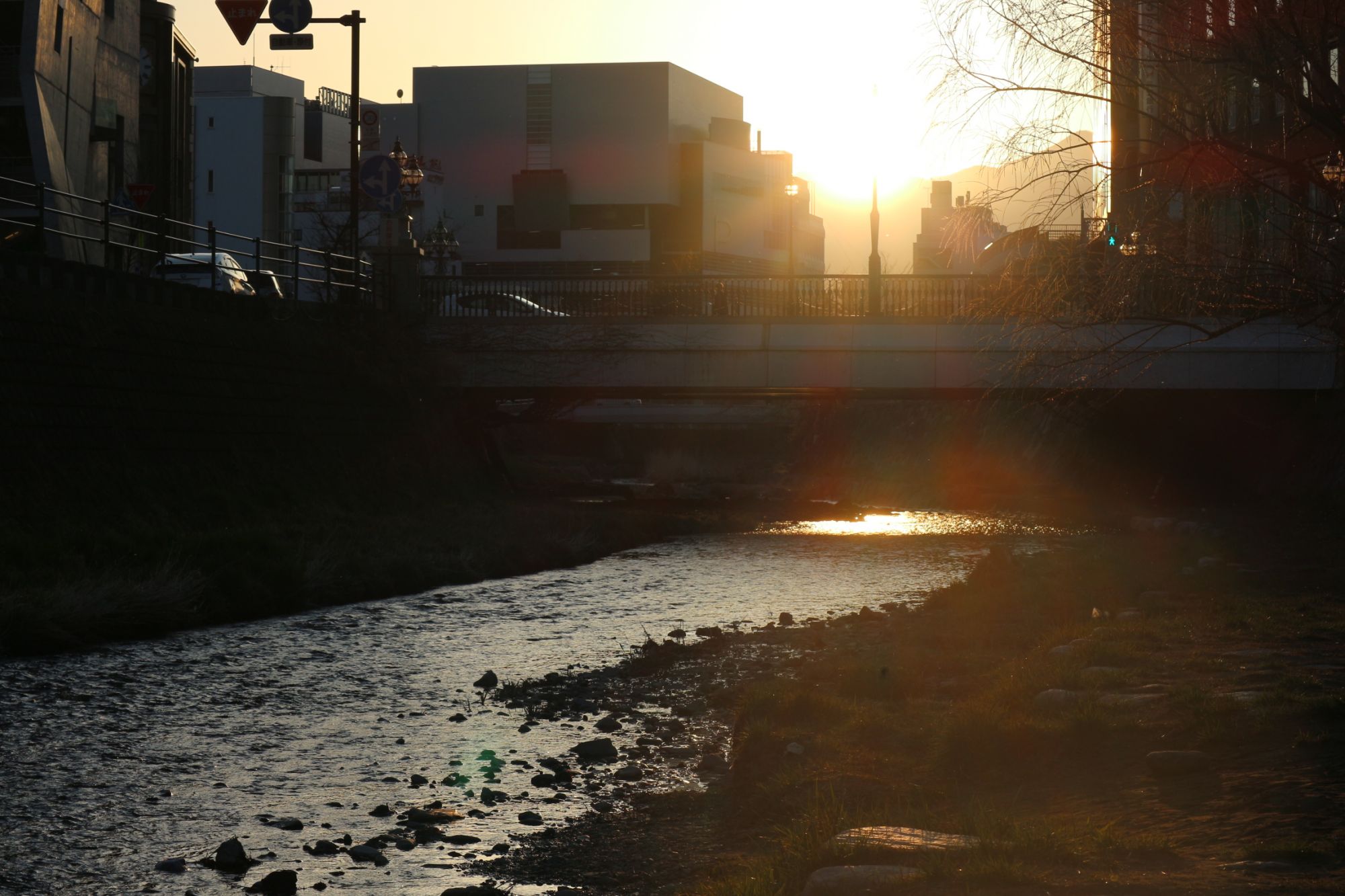 夕方四柱神社前の女鳥羽川 日が傾き水面がキラキラ光って・・