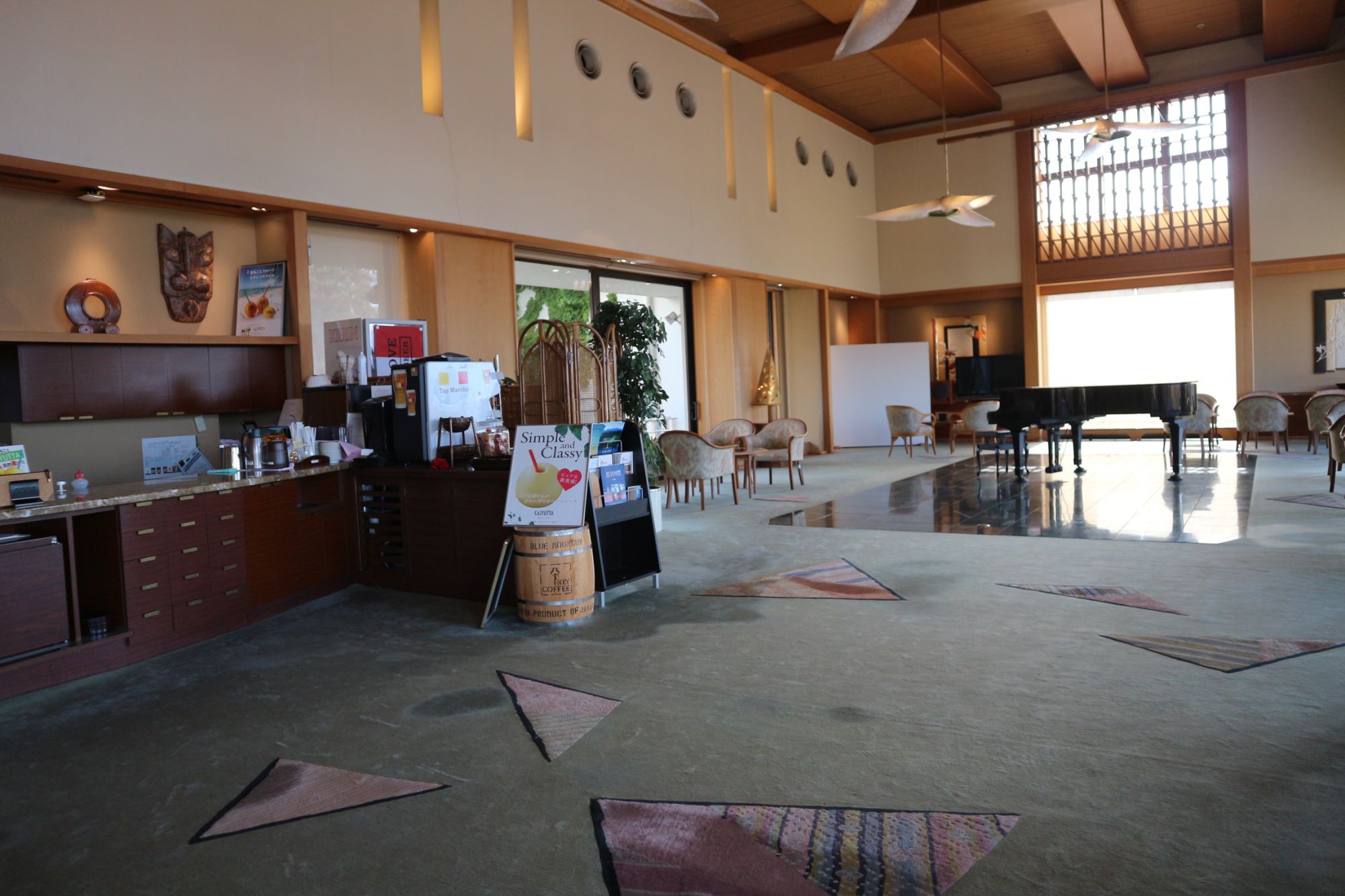 中に入ると広くて豪華なインテリアのロビーそしてテラスの向こうには、