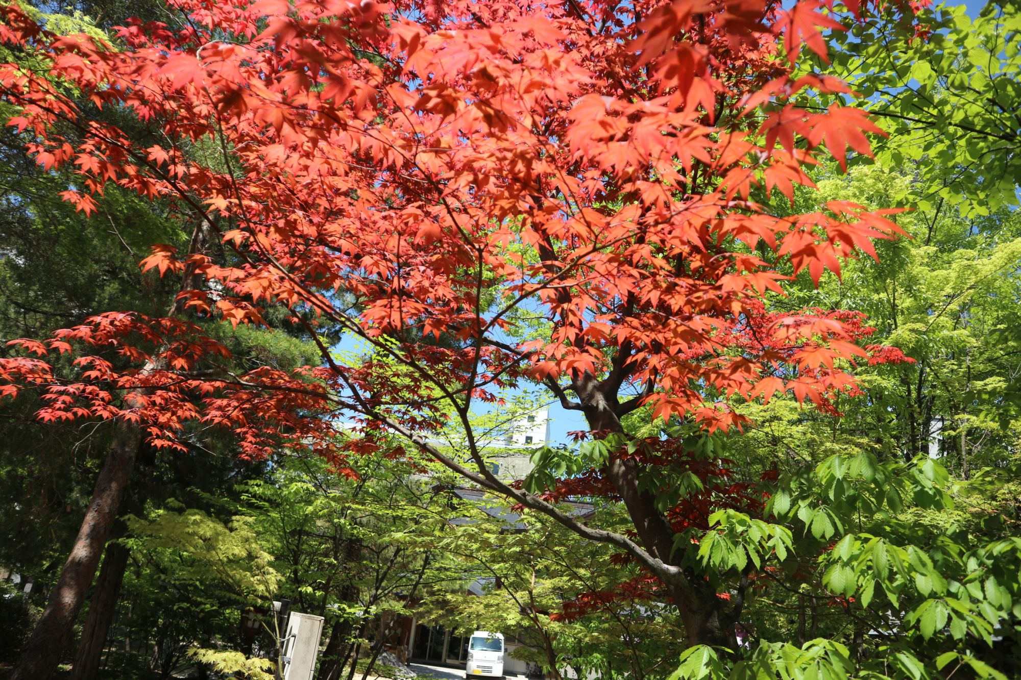 新緑の中に赤く彩るノムラモミジ(たぶん)