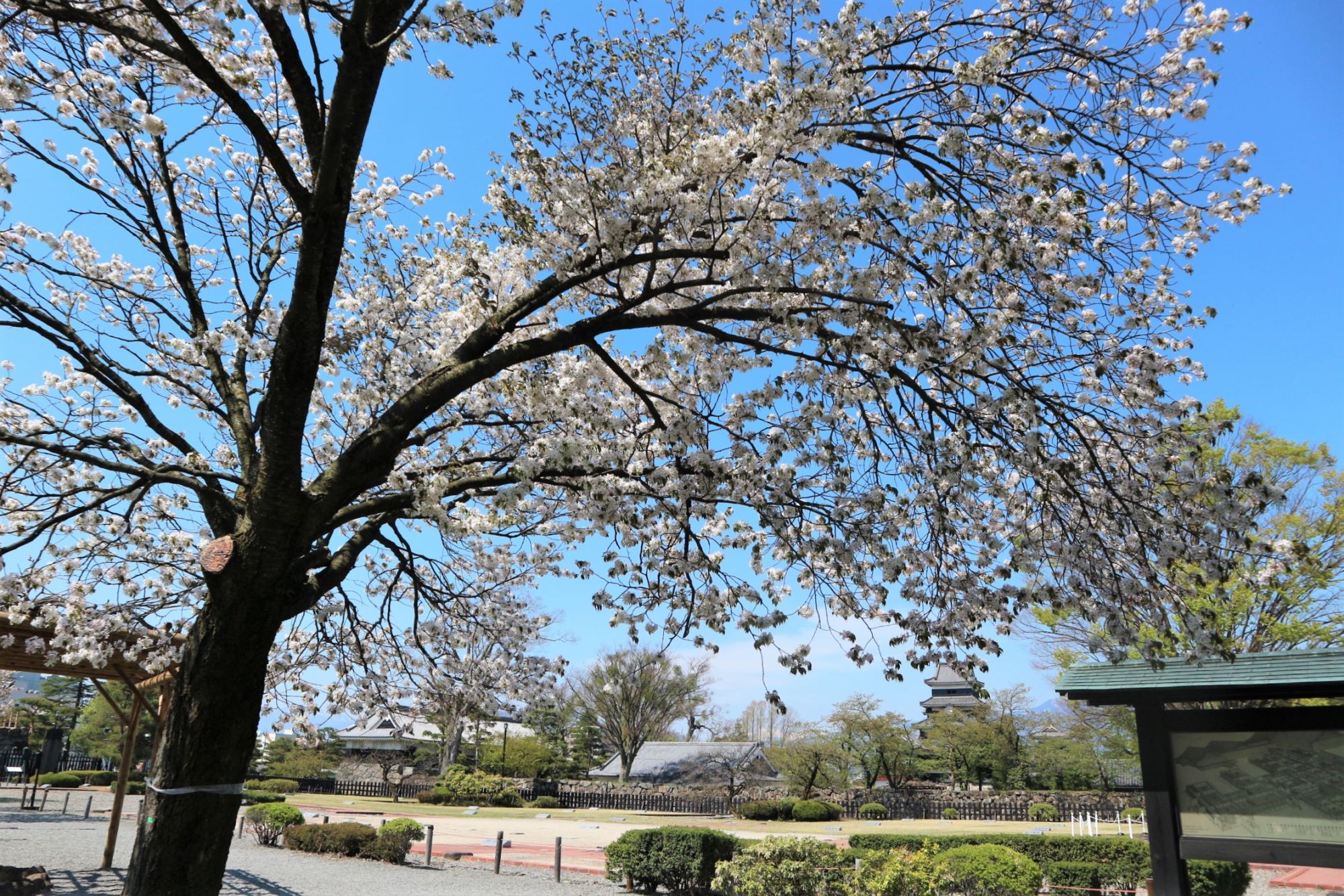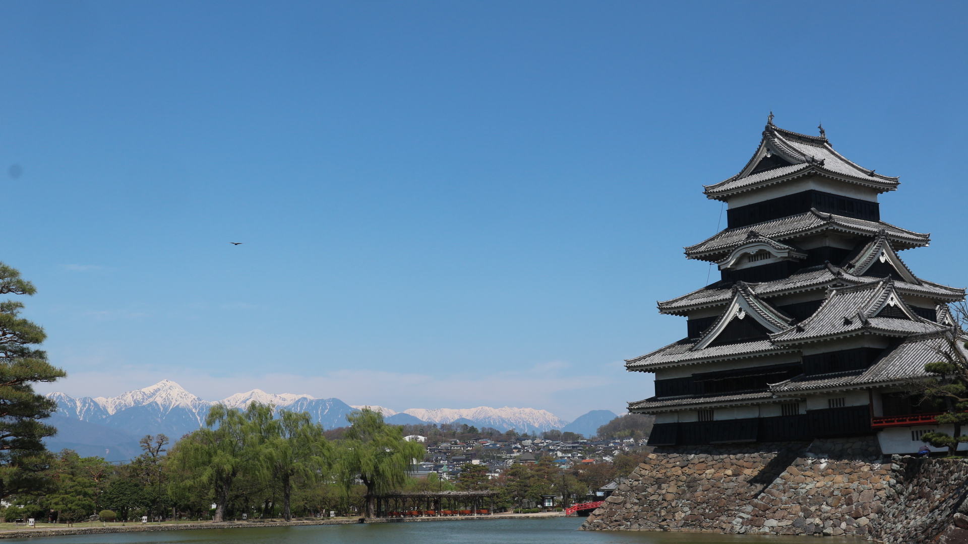 雪解けが進んでいる北アルプスを背景に厳かに佇む国宝松本城