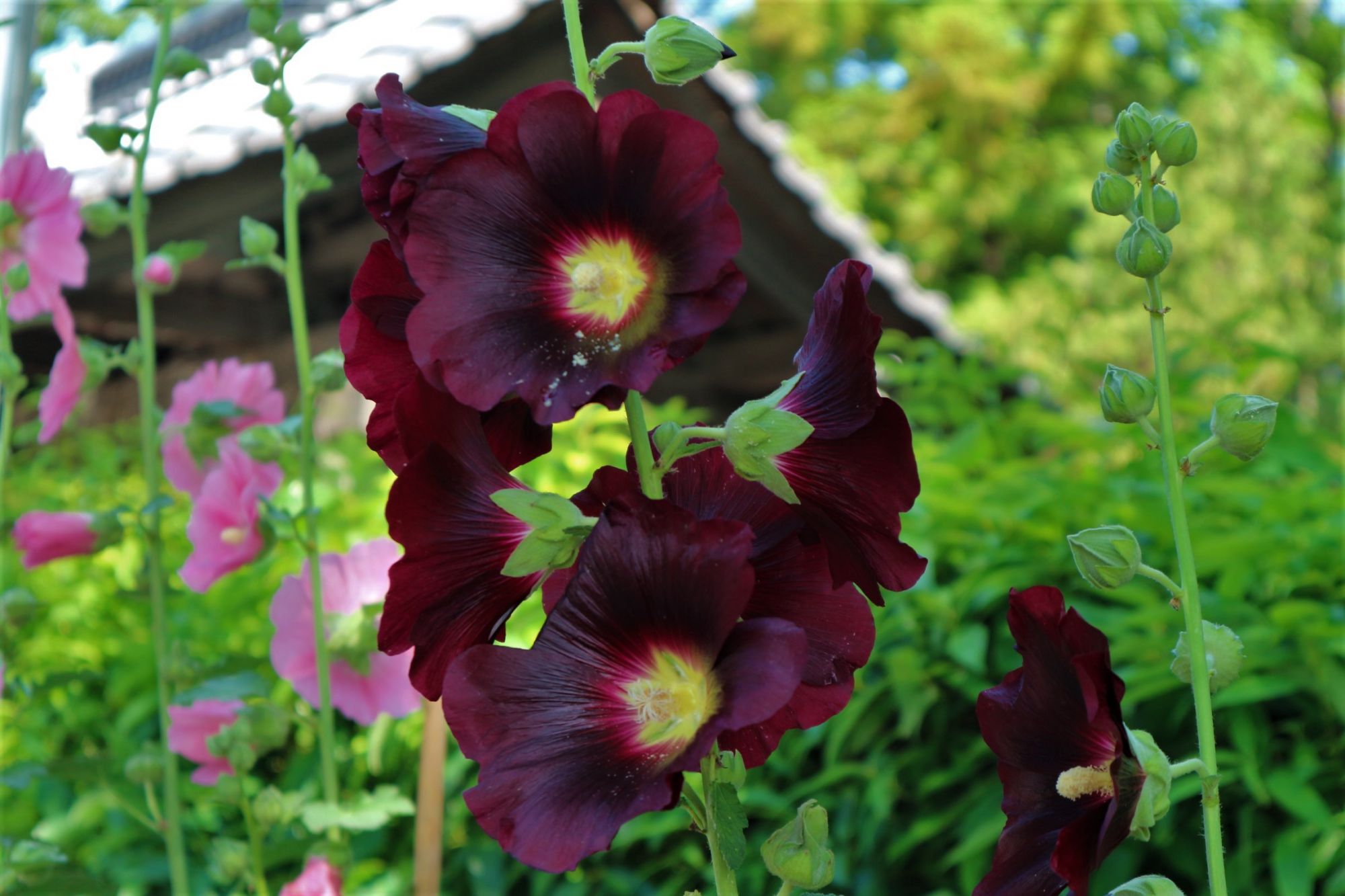 色とりどりのタチアオイの大輪の花は、華やかに梅雨の晴れ間に映えます。