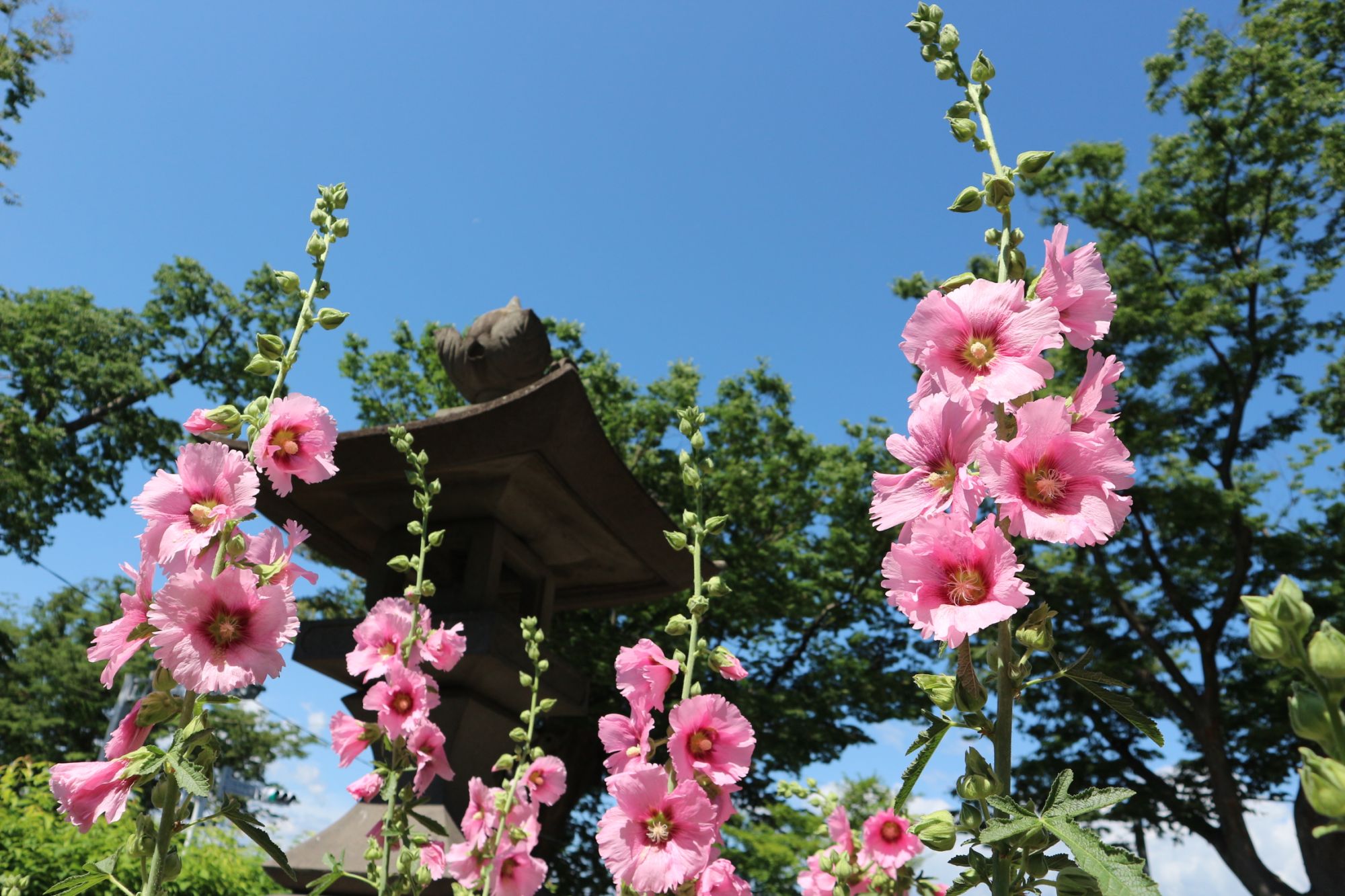 国宝松本城の北にある「松本神社」6月から咲き始める立葵(タチアオイ)は、季節を知らせる花として有名です。