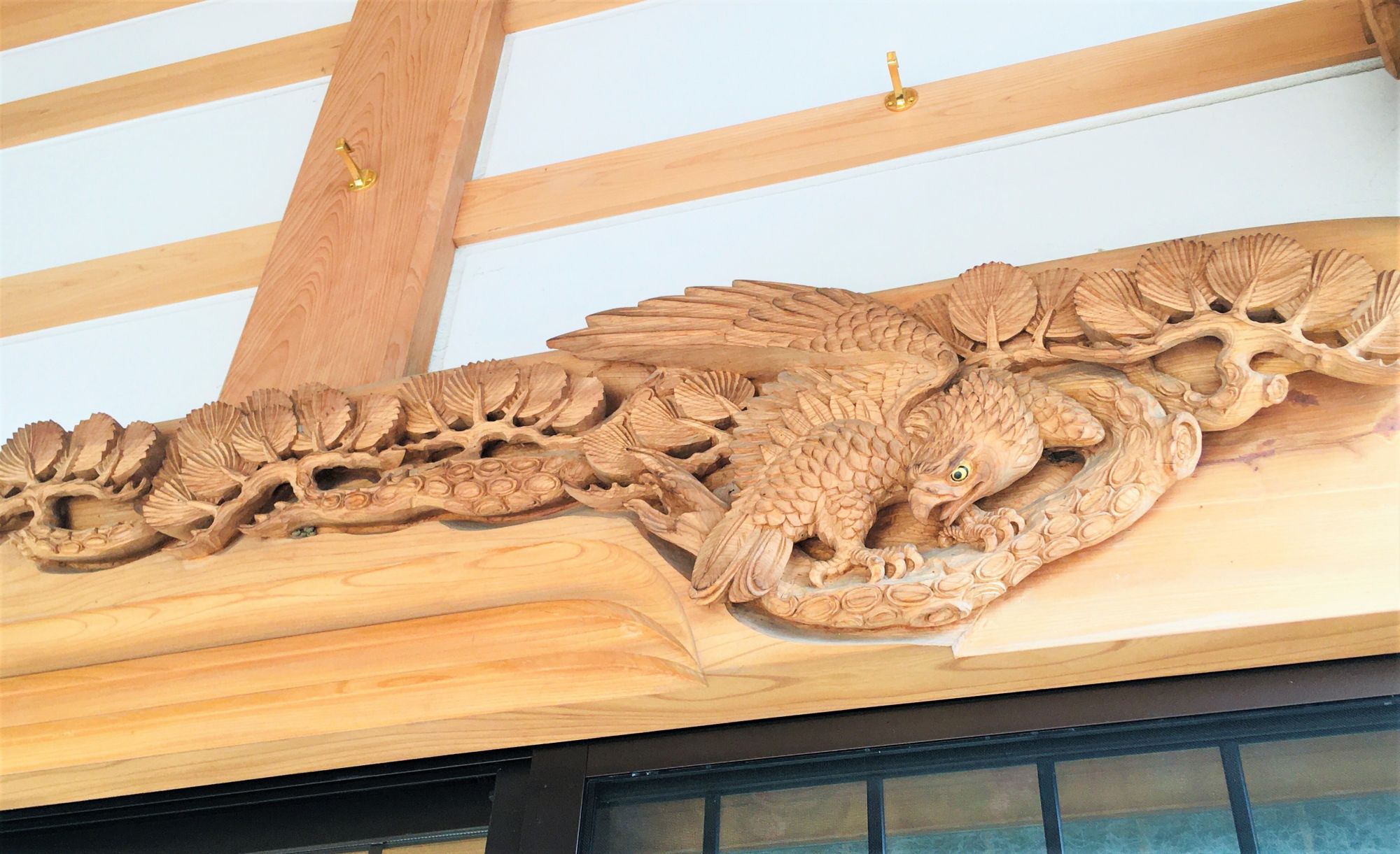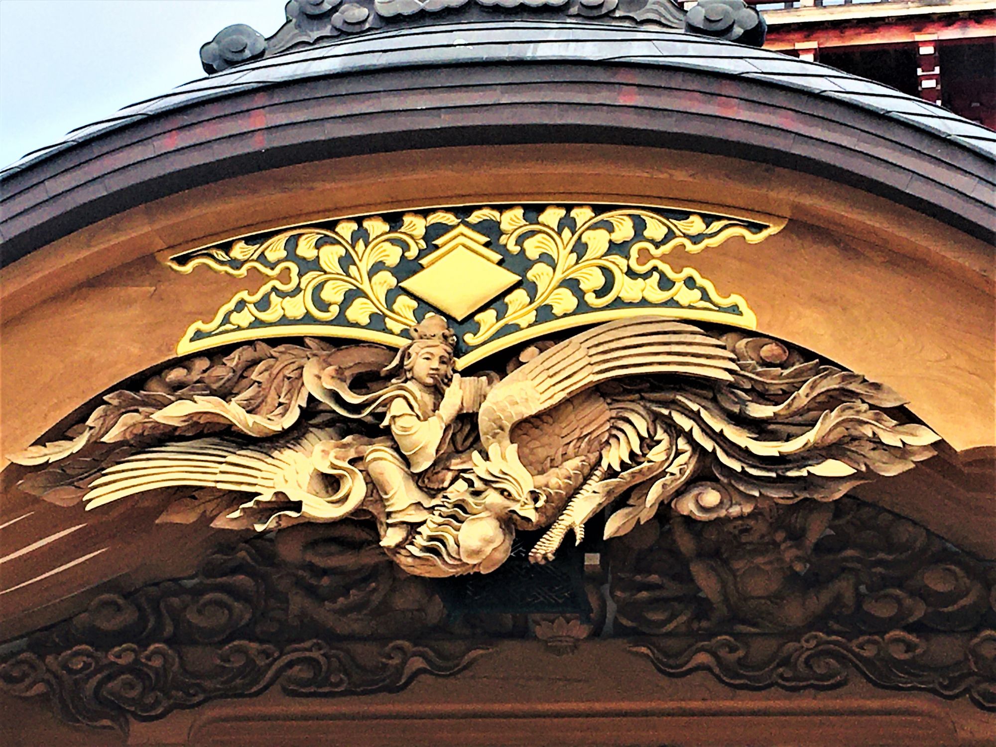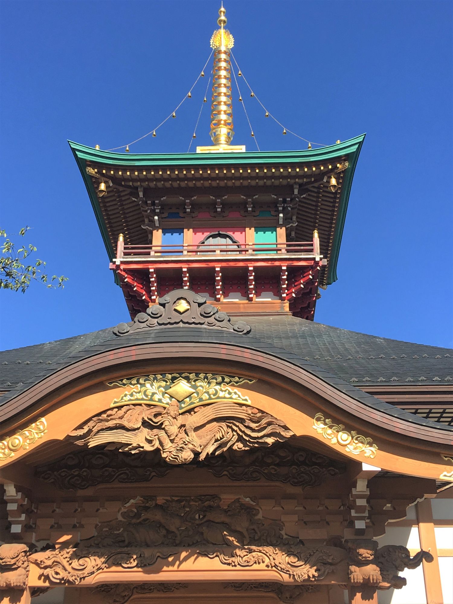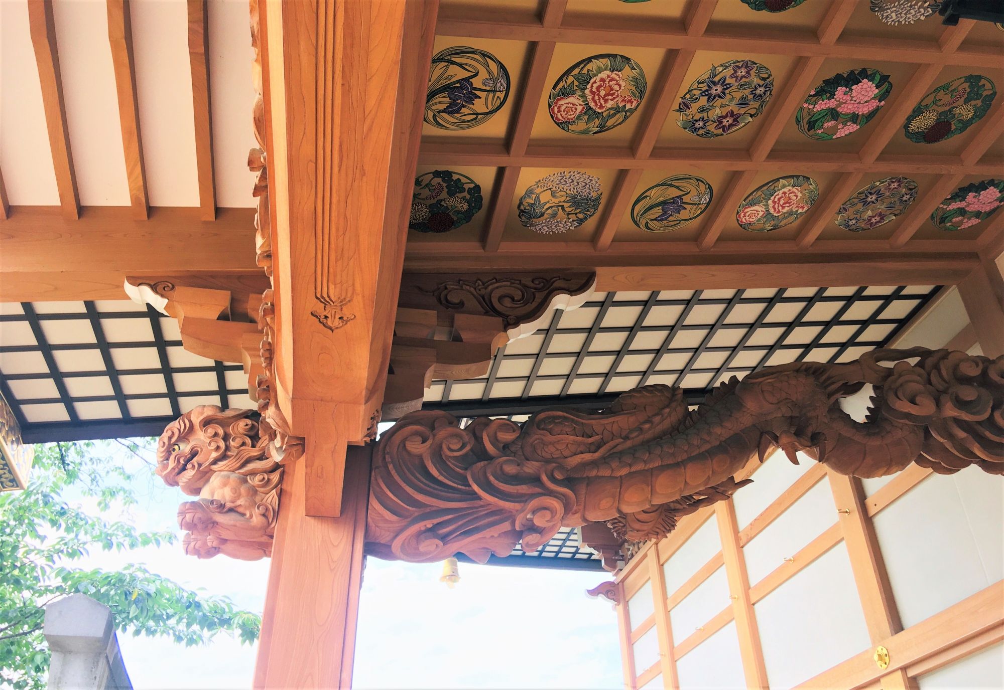 Der Eingang zur Gebetshalle ist mit kunstvollen Zeichnungen und Holzschnitzereien geschmückt. Die Holzfiguren stammen von einem Künstler aus der Region (Herr Nakamaki, Azumino).