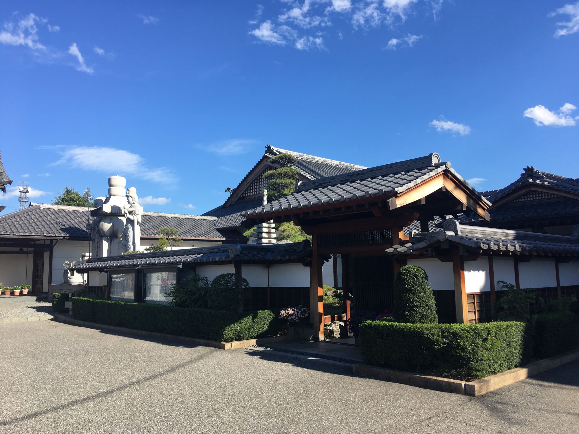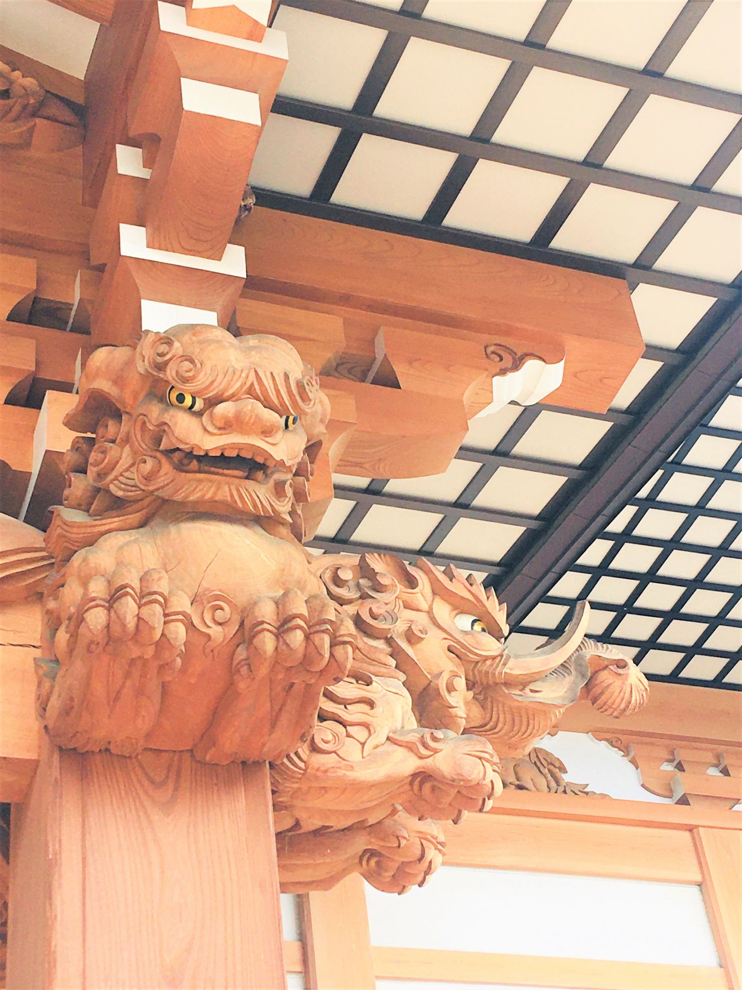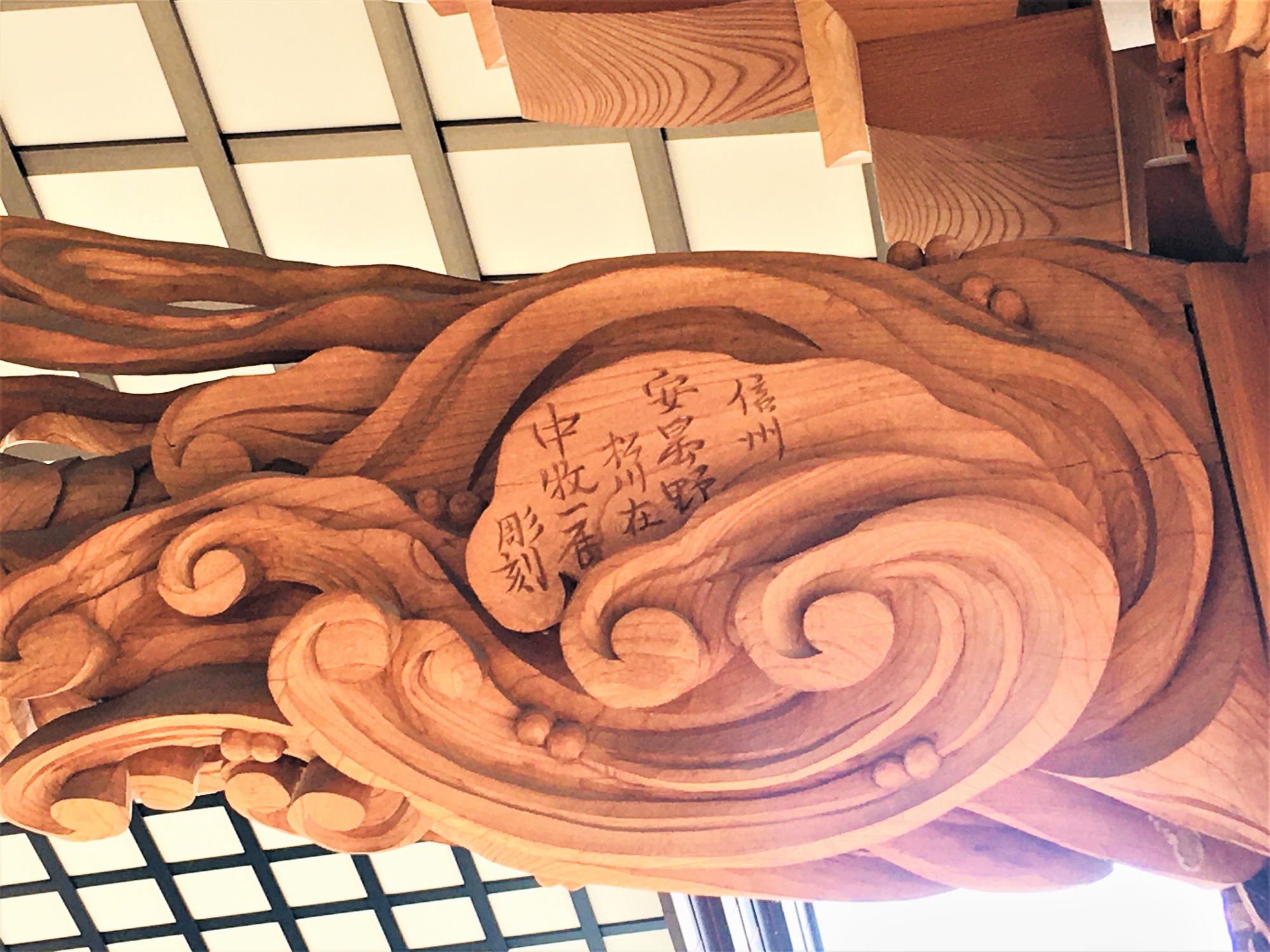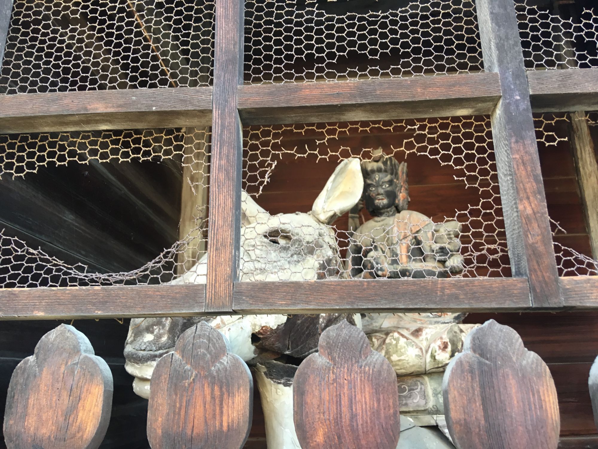 Der Eingang zur Gebetshalle ist mit kunstvollen Zeichnungen und Holzschnitzereien geschmückt. Die Holzfiguren stammen von einem Künstler aus der Region (Herr Nakamaki, Azumino).