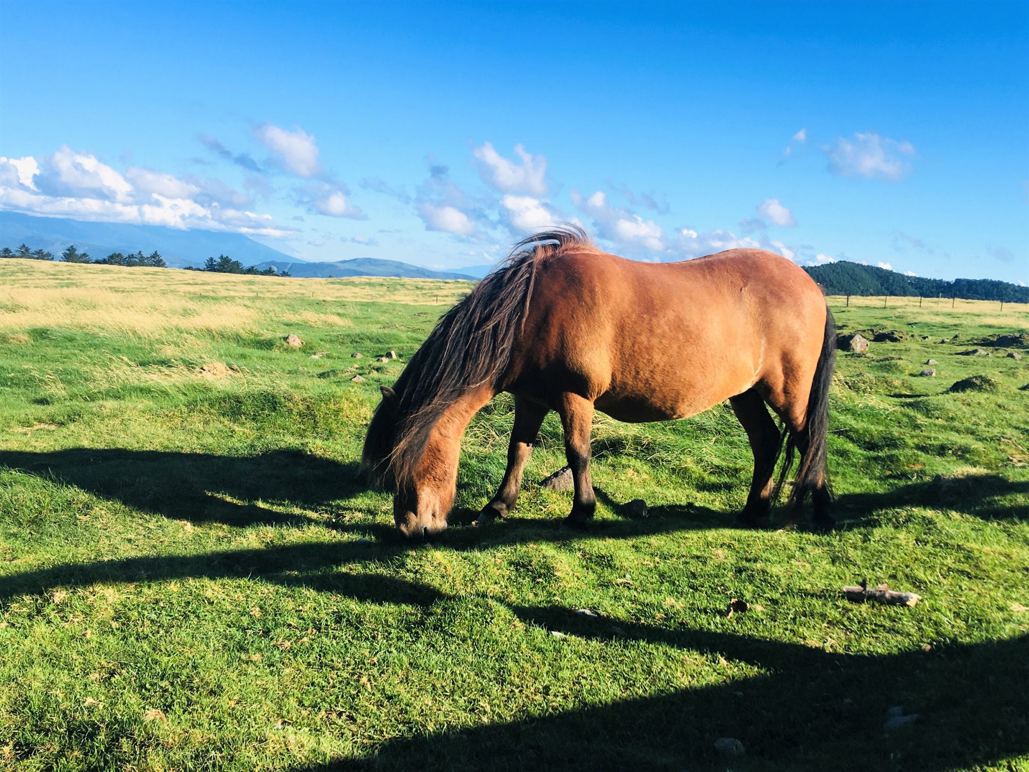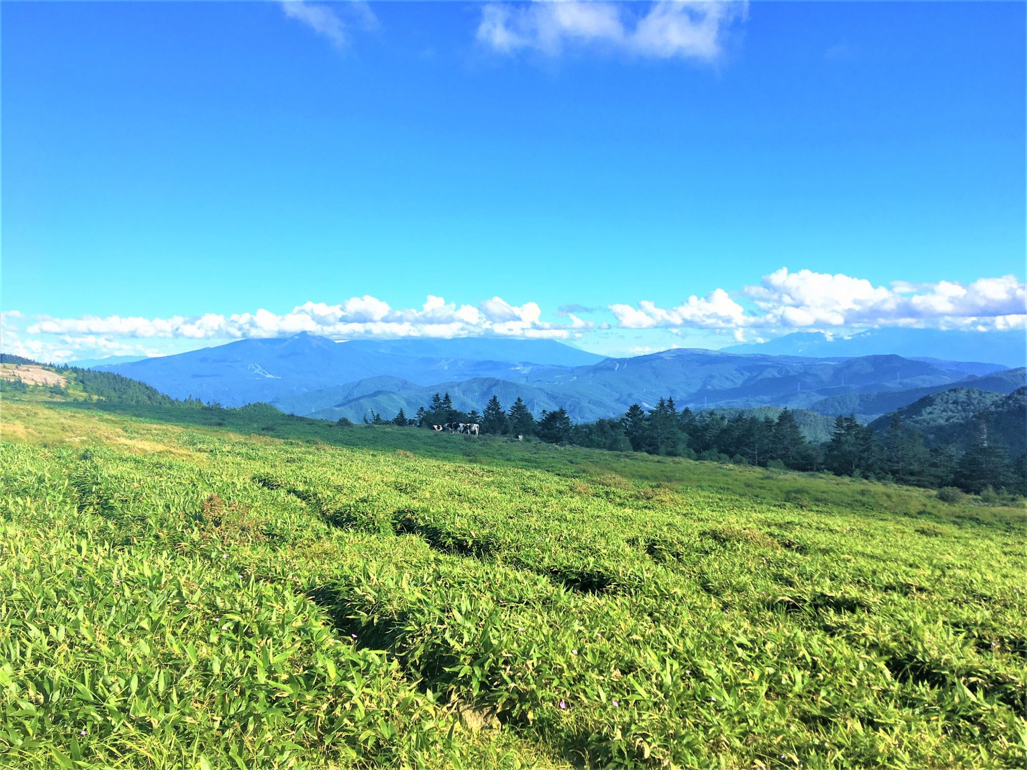 Das Hochland Utsukushi-ga-hara, übersetzt die schönen Felder, lockt vor allem in den Sommermonaten mit etwas Kühle in 2,000m Höhe und mit einem 360° Panorama-Blick, der bei klarer Sicht sogar bis zum Berg Fuji reicht. Das Plateau befindet sich in der Mitte der Nordalpen und soll vor ca. 2. Millionen Jahren entstanden sein. Das erste was ich sehe, sind schwarz-weiße Bilderbuch-Kühe, die hier Urlaub machen, weil es im Tal zu warm ist.