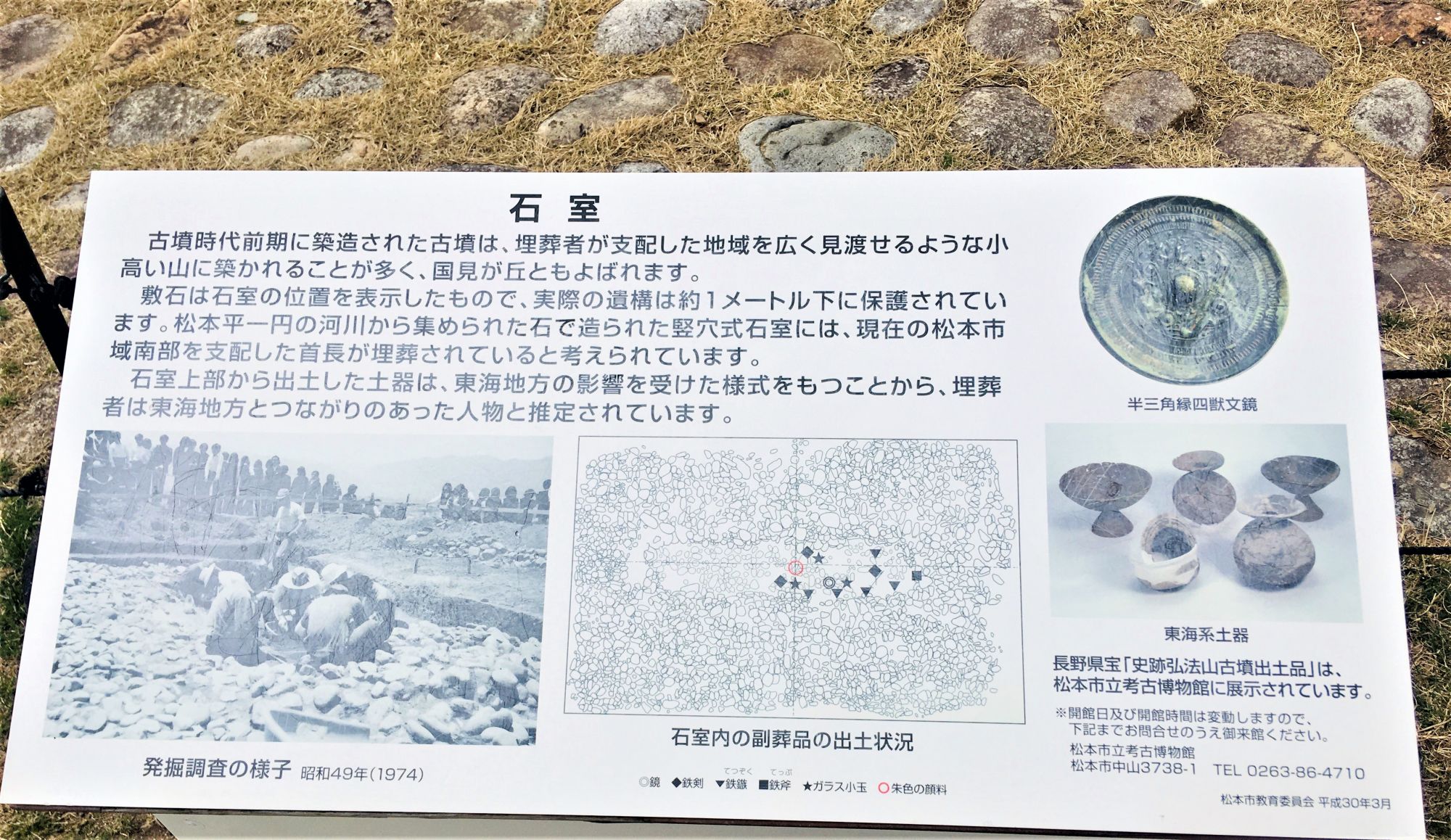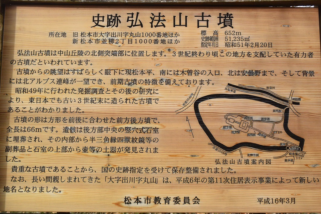 Im Süden von Matsumoto erhebt sich der Koboyama (弘法山), ein ehemaliger Grabhügel aus dem 3. Jahrhundert, hervor. Eine historische Stätte, wo auch Tonkrüge aus dieser Zeit gefunden worden.