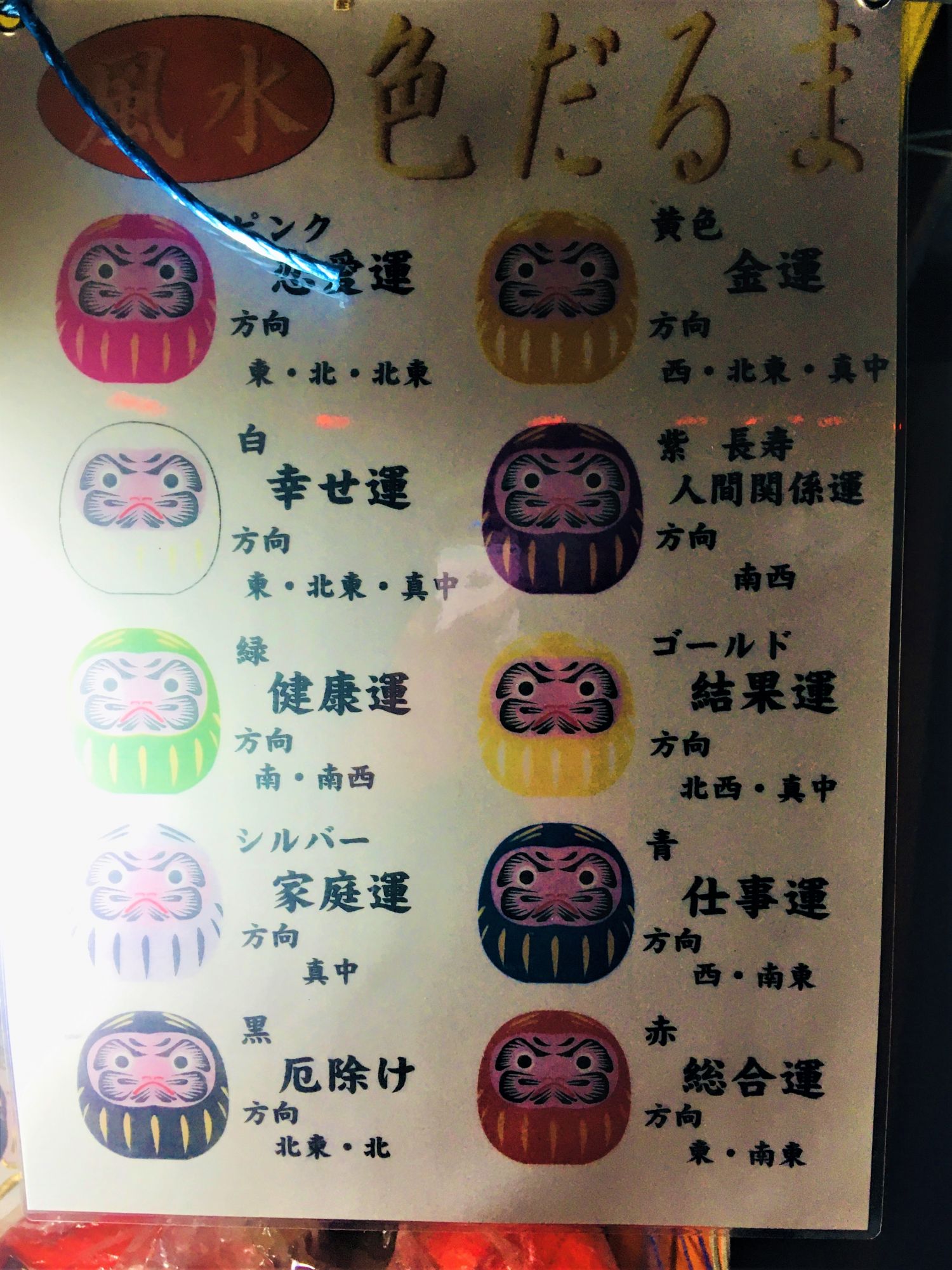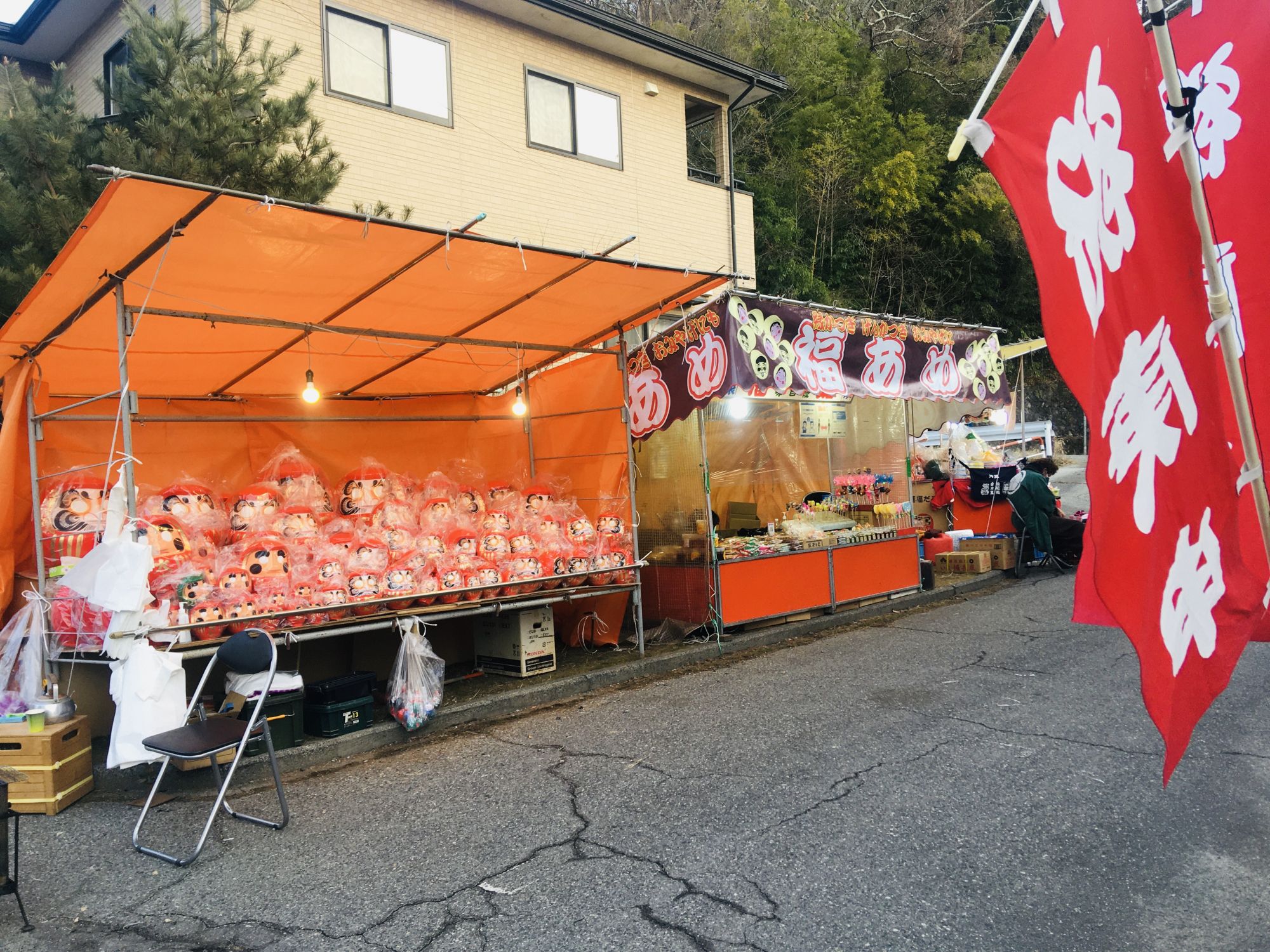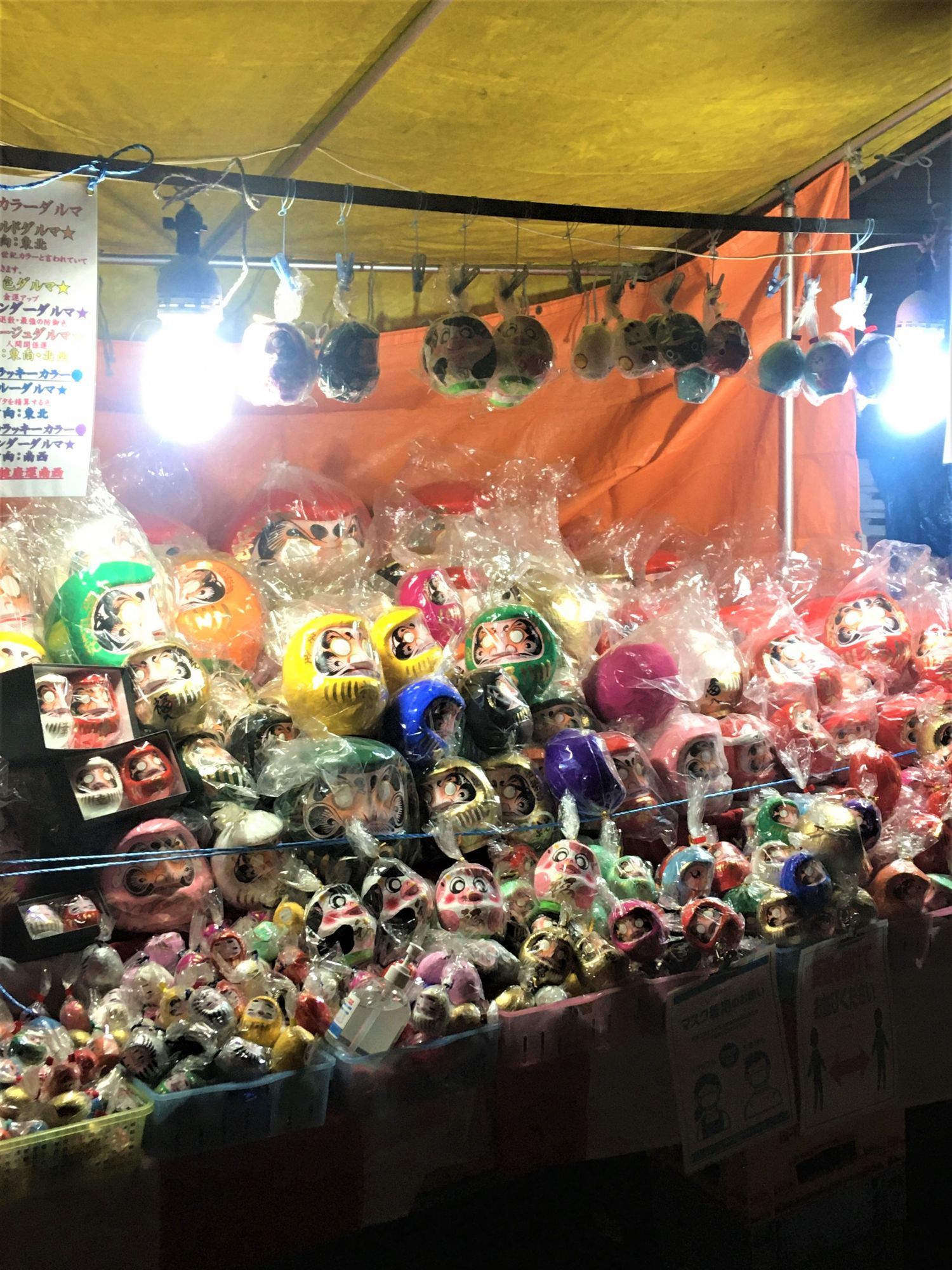Allgemein ist das Fest auch als „Daruma Markt“ bekannt, da es mehrere Stände gibt, an denen man sich im neuen Jahr mit den glückbringenden Daruma eindecken kann. Ich dachte, Daruma sind immer rot, aber hier werden diese in verschiedenen Farben verkauft und jede hat eine andere Bedeutung. So steht Grün für Gesundheit, Gelb für finanzielles Glück, Schwarz für Gefahrenabwehr usw.