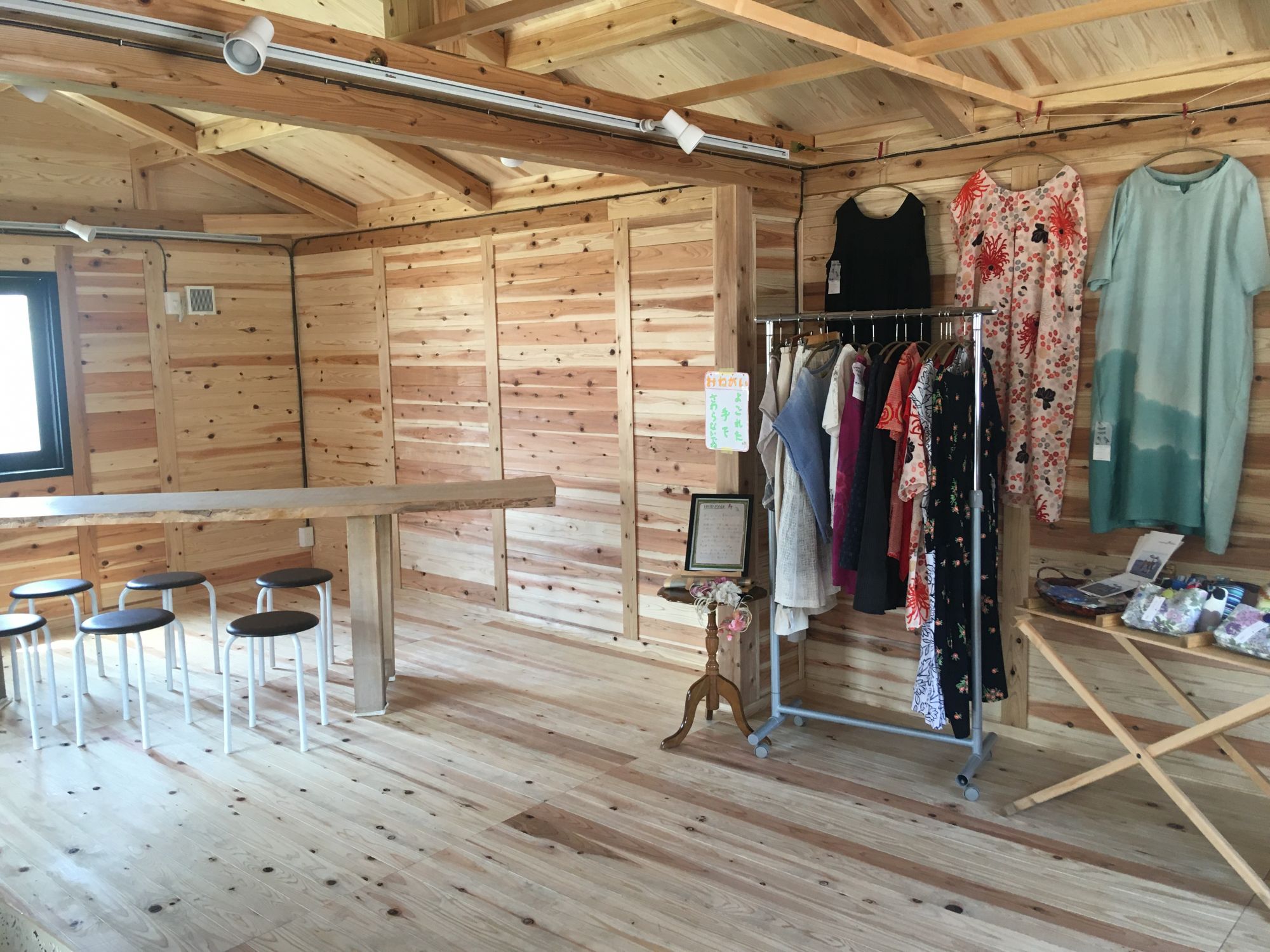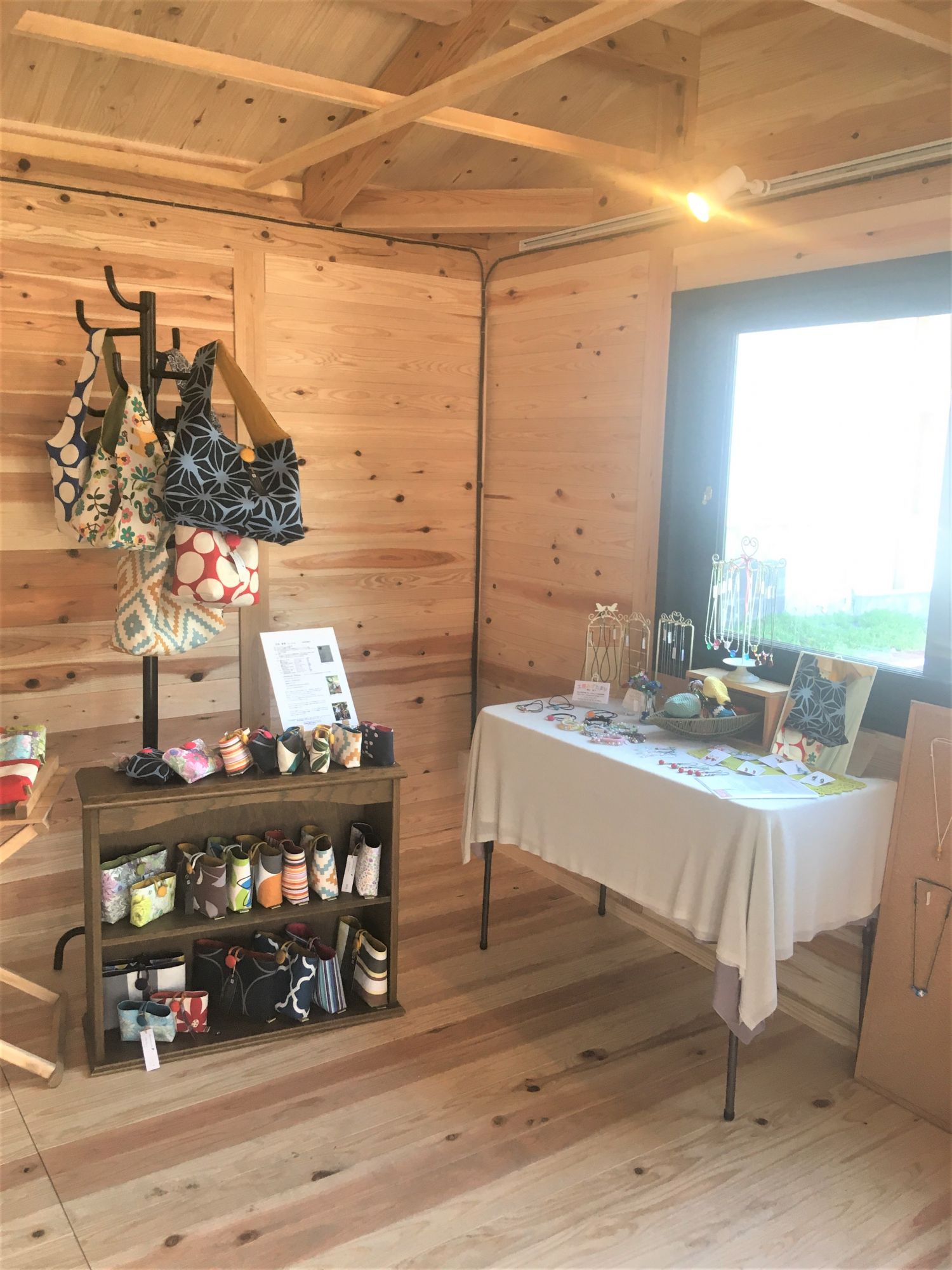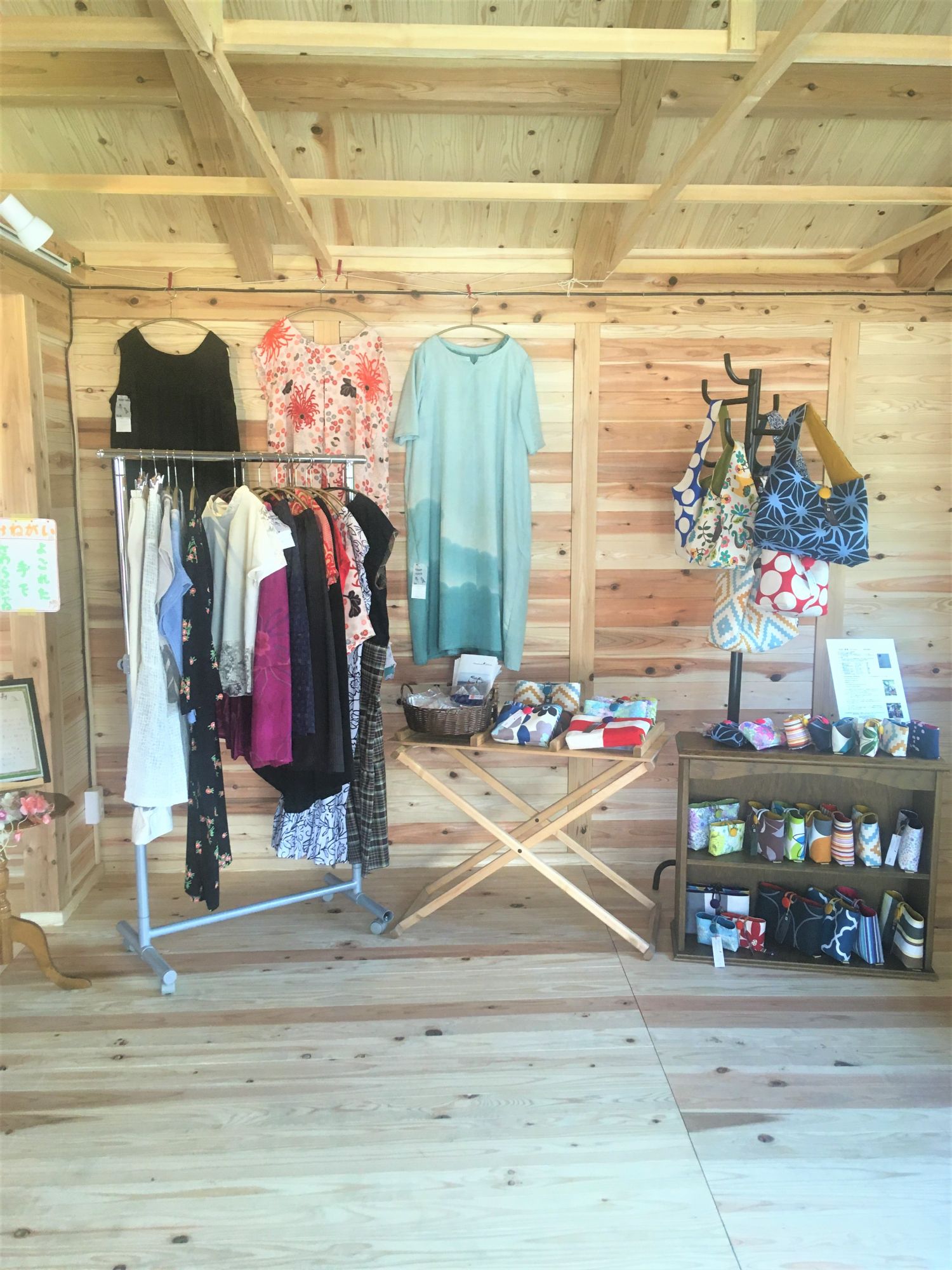 Während der Corona-Einschränkung wird die Hütte allerdings als Ausstellungsraum für lokale Handwerkskunst genutzt. Jetzt, wo alle viel Zeit zu Hause verbringen, entstehen viele kreative Arbeiten. Die Leute aus der Region können ihre Arbeiten hier zum Verkauf anbieten. Aus alten Kimonos werden luftig sommerliche Hosen und Röcke, oder schicke Kleider. Es gibt natürlich auch die unverzichtbaren Mundschutzmasken in verschiedenen Variationen.