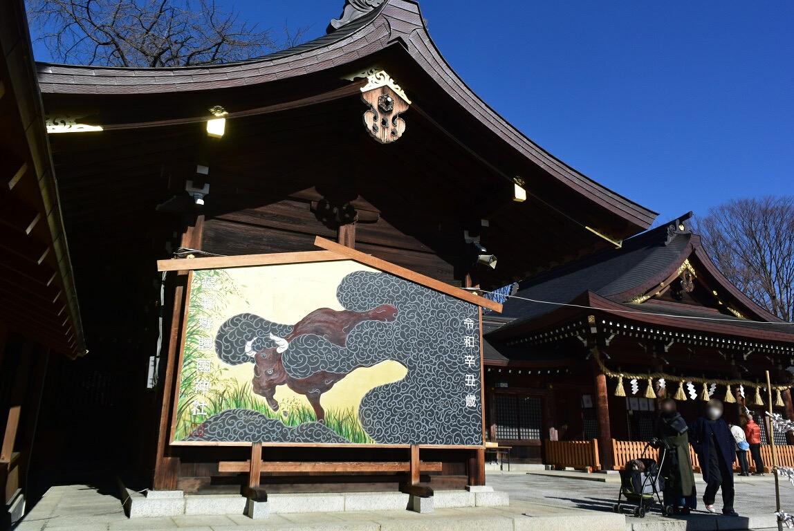 Auch in diesem Jahr schmückt ein großes Bild des aktuellen Tierkreiszeichens (“ema” 絵馬) den Schrein und ist ein sehr beliebter Fotospot. Das Bild wurde wieder von der Künstlerin KAZAHO FURUSHO gemalt, zum letzten Mal in diesem Jahr, dann darf sich ein anderer Künstler an den 12 Tierzeichen versuchen. Das Bild in diesem Jahr wirkt dunkel und bedrohlich, ein Ochse, der sich durch dunkle Wolken vorwärtsschiebt. „Er soll Stärke, aber auch Ruhe ausstrahlen“, so die Künstlerin in einem Interview: “…den Geist frei von Ängsten und Leiden sein zu lassen… Das ist es, was wir brauchen, wenn wir uns durch das Jahr 2021 bewegen.“