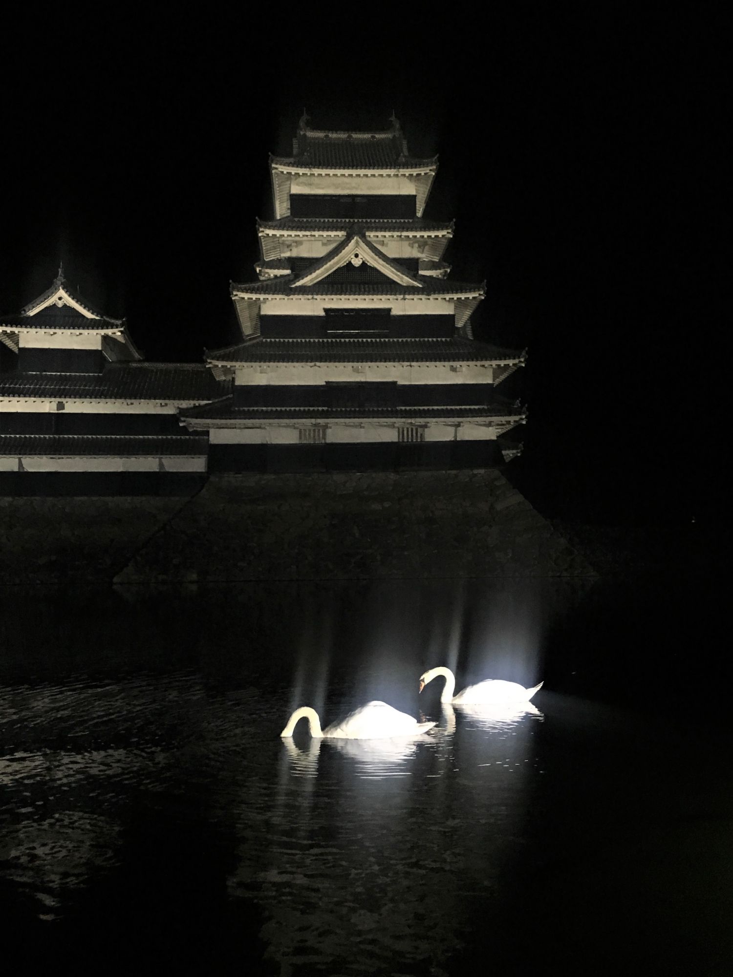 Die Burg spiegelt sich auf der Wasseroberfläche des Burggrabens, auf dem weiße Schwäne schwimmen. Eine klare Vollmondnacht ist für einen Besuch besonders empfehlenswert.
