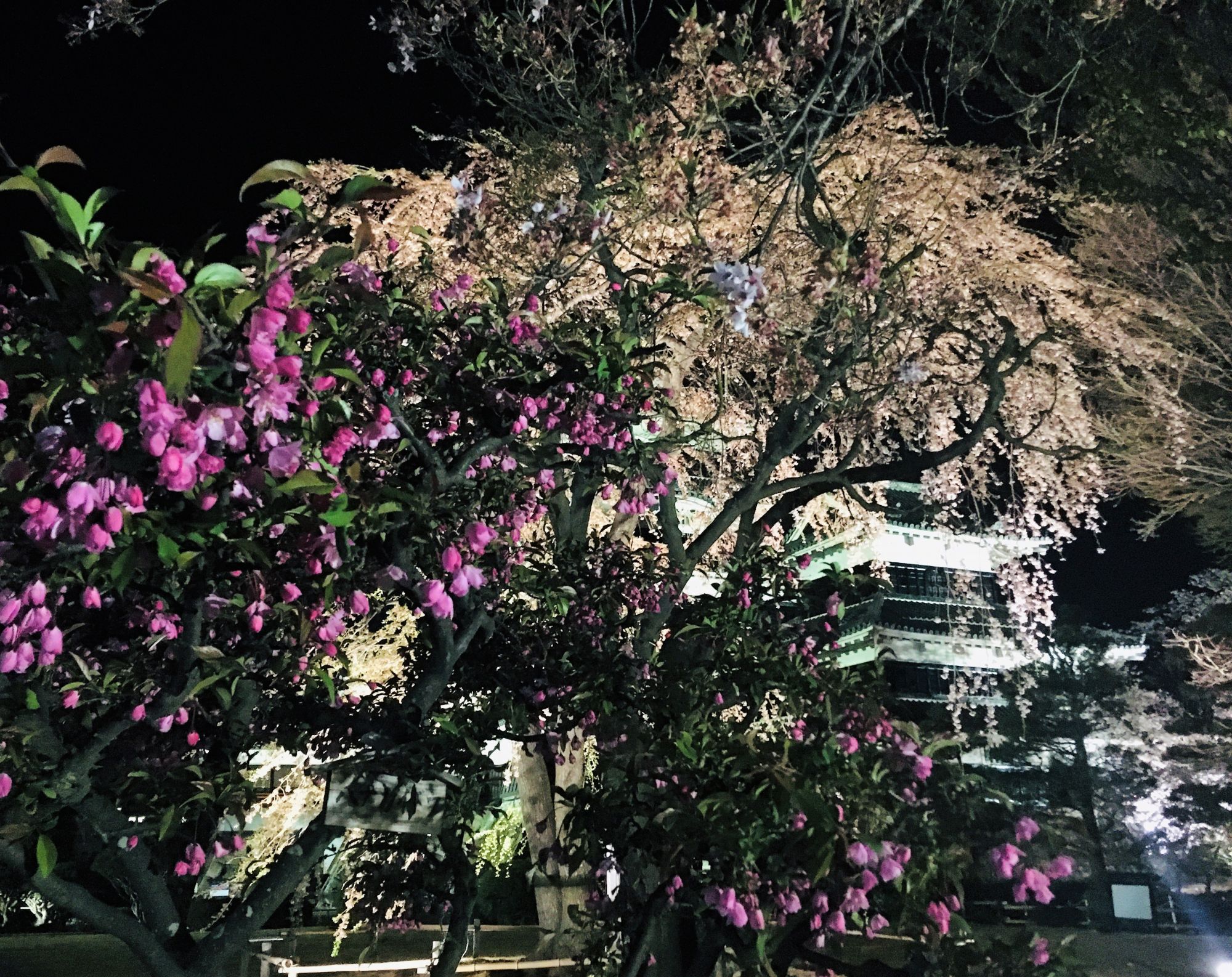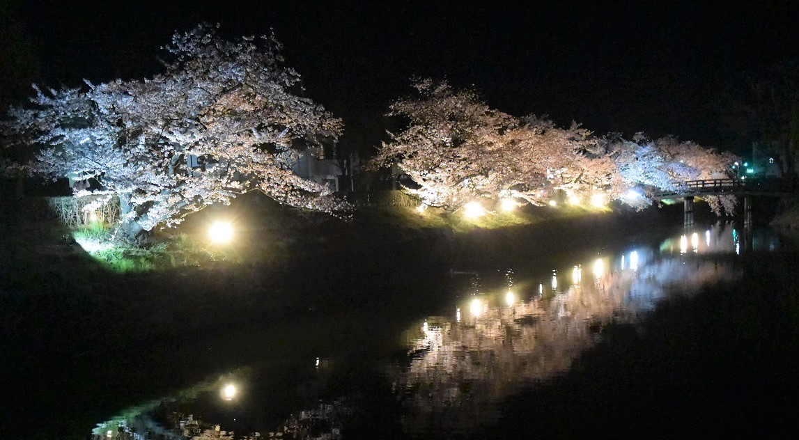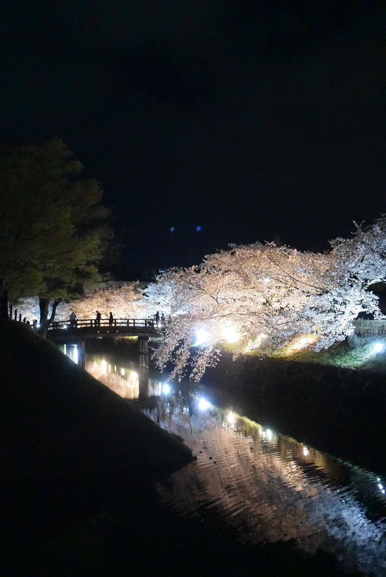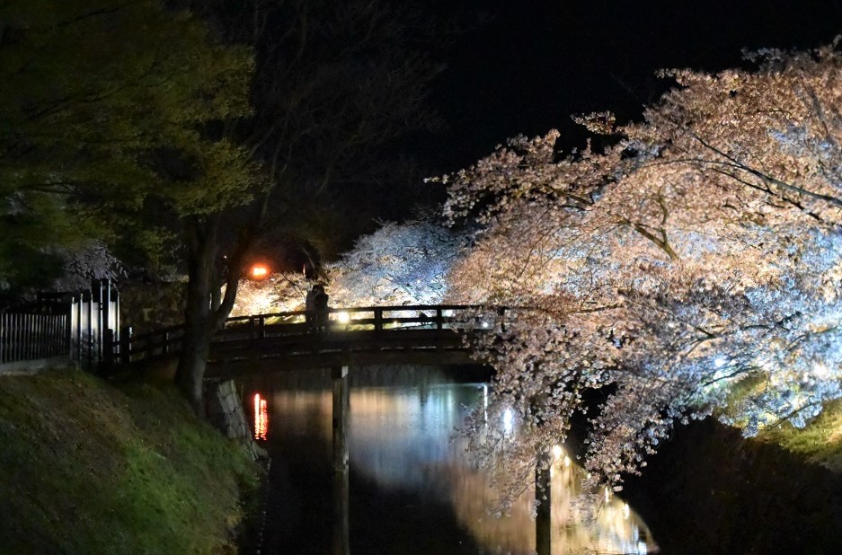 Ein Highlight ist die Abendbeleuchtung während der Kirschblüte. 8 Tage lang ab Beginn der Kirschblüte werden die Kirschbäume entlang des Burggrabens beleuchtet.