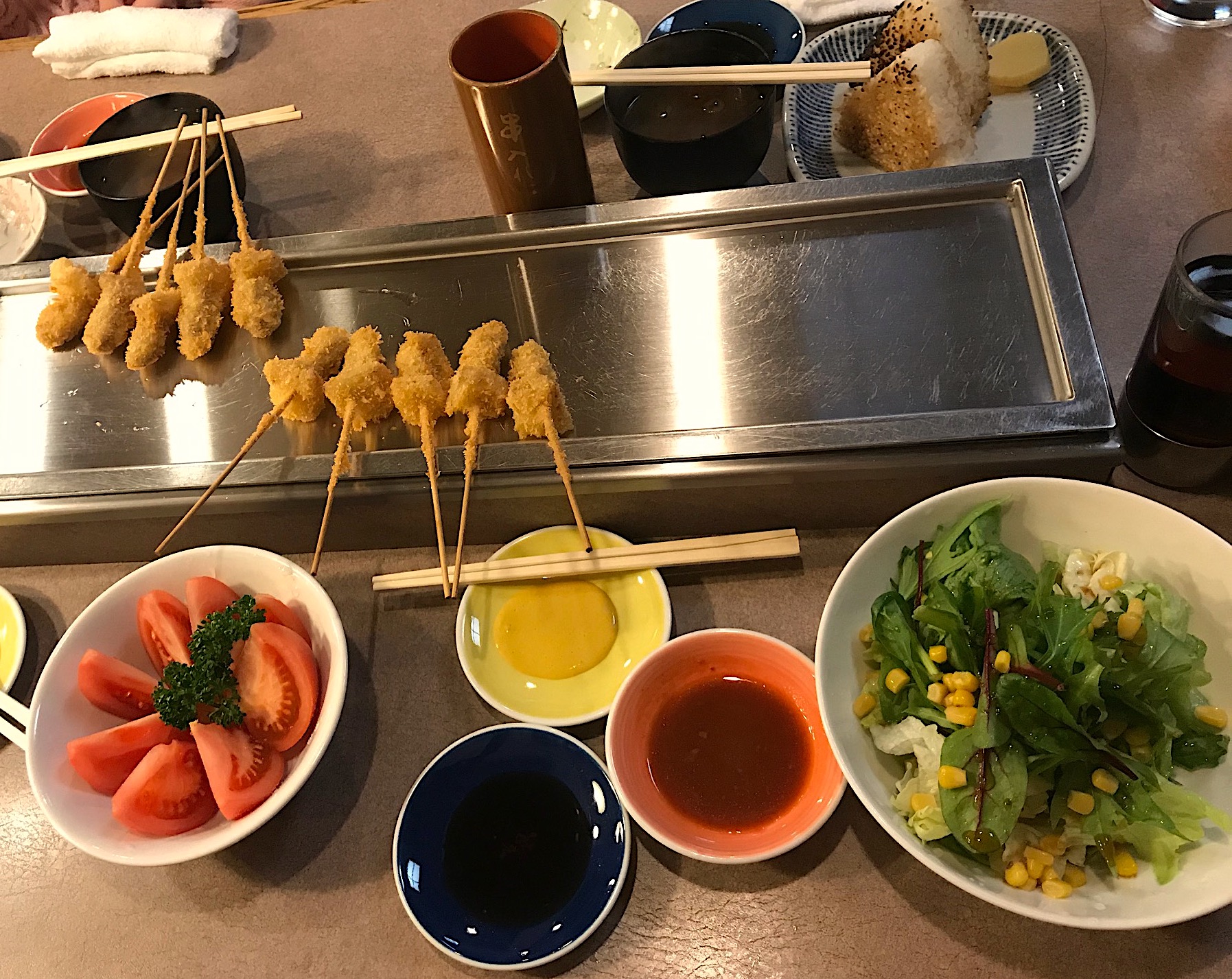 Традиционные якитори представляют собой небольшие кусочки куриного мяса, насаженные на бамбуковые шпажки и обжаренные на огне. Подаётся блюдо в горячем виде, прямо с огня. Перед употреблением мясо обмакивают в соус – либо кисло-сладкий соус якитори, либо в цитрусовый соус на основе лимона и лайма, либо же употребляют с обычной японской горчицей. Ассортимент современных якитори необычайно широк и теперь под этим названием Вам предложат отведать не только курятину, но и говяжую печень и язык, свиную вырезку и небольшие тефтельки с перепелиным яйцом внутри, самые разнообразные овощи запеченные на огне с мясом либо обжаренные во фритюре.