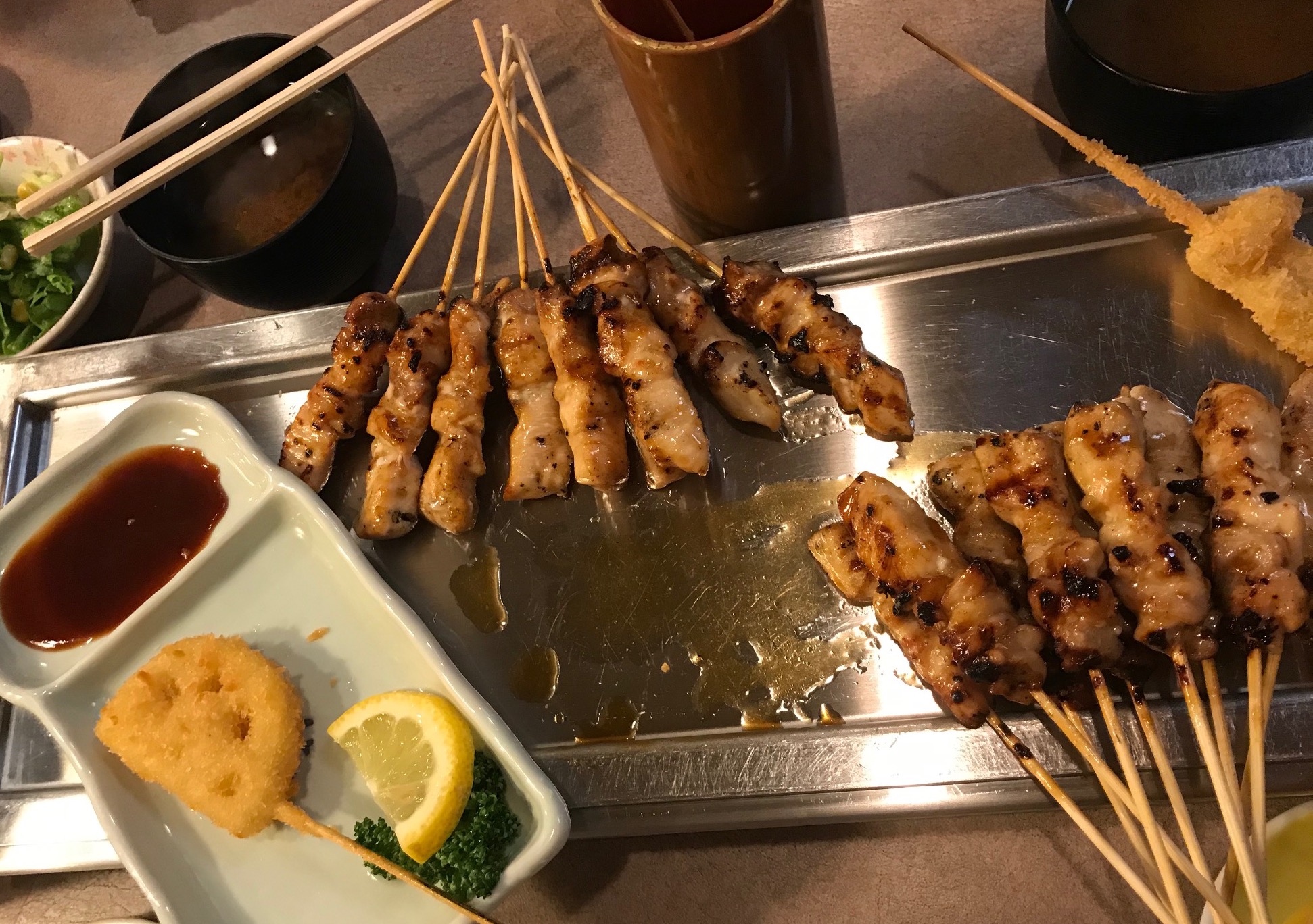 Если Вы спешите, то якитори можно заказать на вынос. Для этого в ресторане есть специальное take out меню. Горячие шпажки пакуют в большие бумажные стаканы, плотно закроют крышкой и в придачу дадут различных соусов.