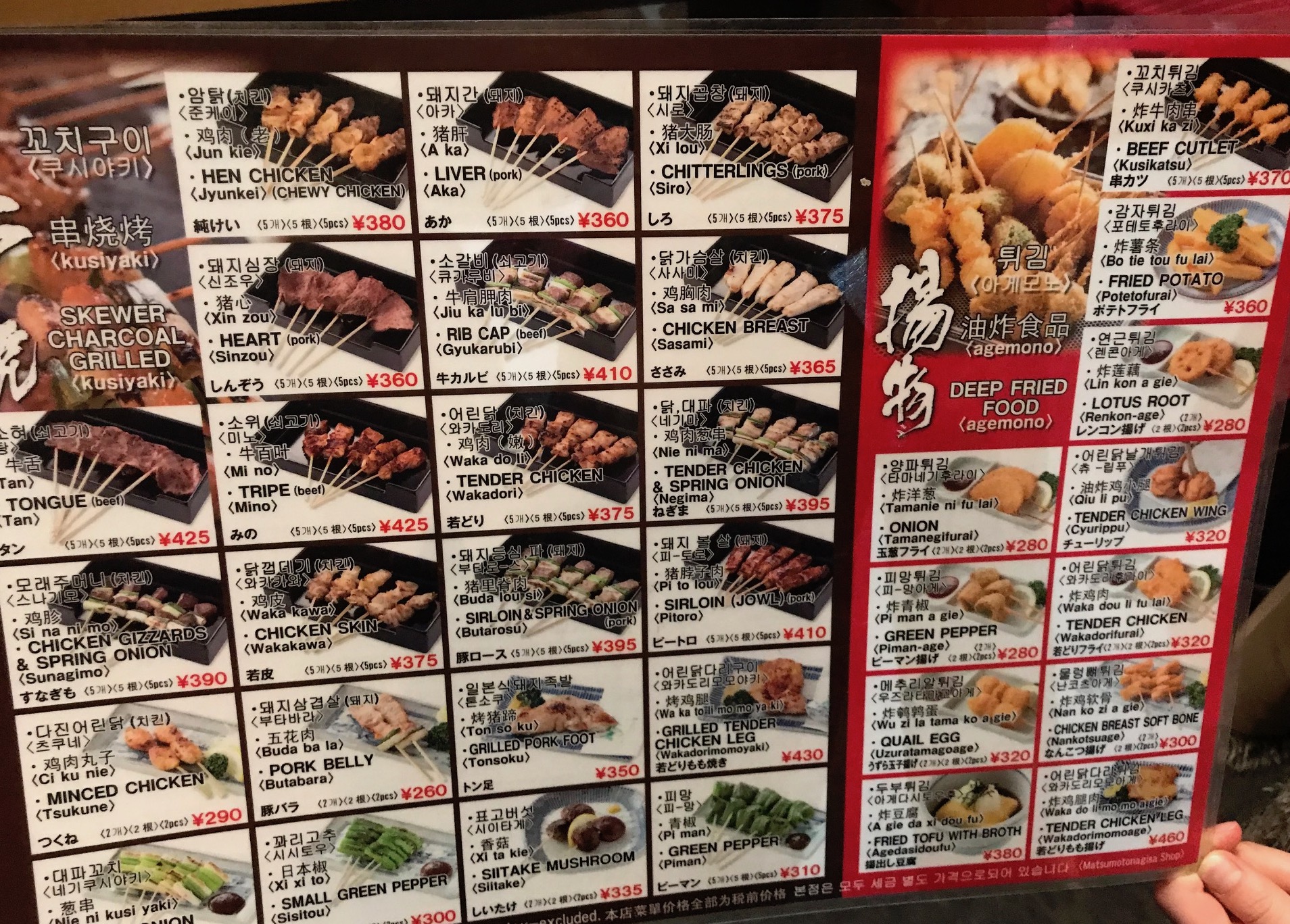 Один из лучших ресторанов, где подают якитори находится в районе Нагиса города Мацумото. Сети “якиторишных” от Акиёси хорошо известна в Японии, её рестораны раскиданы практически по всей стране. История Акиёси началась в далеком 1959 году, кода Такео Симокава открыл своё первое заведение в городе Фукуи, одноименной префектуры, что располагается на острове Хонсю, на берегу Японского моря. Первые ресторан (если его можно так назвать) занимал площадь в 4 татами, что составляет порядка 6 с половиной метров квадратных и вмещал не более 7ми посетителей. Заведение процветало и полюбилось многим, через 13 лет, в 1972 году был открыт второй ресторан недалеко от горы Фудзи. Дала пошли в гору и еще через 14 лет, в 1986 году была основана корпорация Акиёси Груп, в которую уже входило не только множество ресторанов разбросанных по стране, но и свои цеха по производству полуфабрикатов и соусов. Отличительной чертой сети Акиёси является то, что все овощи, рис и мясо закупаются у японских производителей. Продукты проходят тщательную проверку и в разделочных цехах, где трудится порядка 150 человек превращаются в полуфабрикаты, которые доставляются напрямую в рестораны.