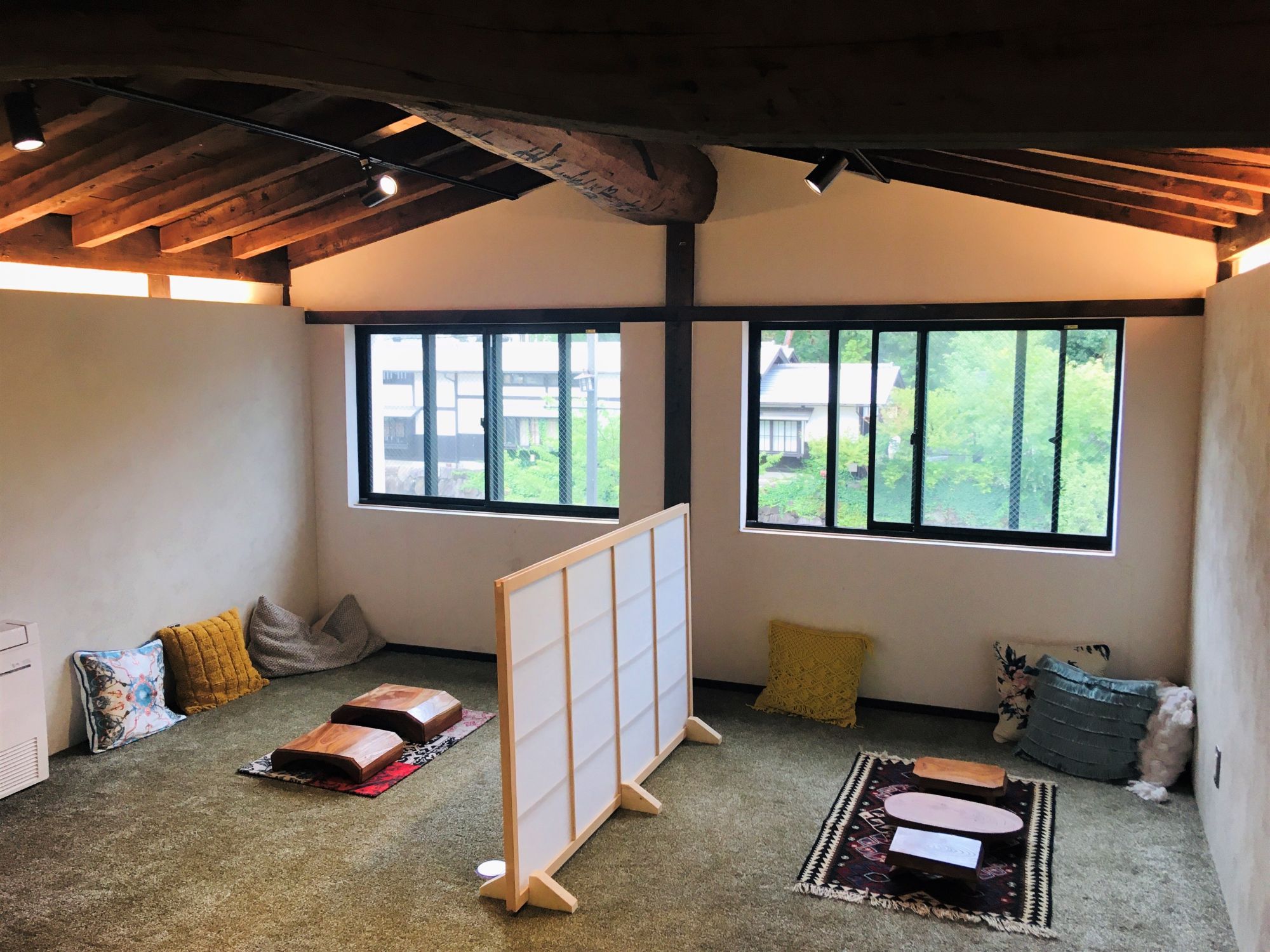 Eine schmale Holztreppe geschmückt mit getrockneten Kräutern führt ins obere Stockwerk, hier ist alles ganz gemütlich und es gibt einzeln abgesteckte Bereiche, die für etwas Privatsphäre und Social Distancing sorgen.