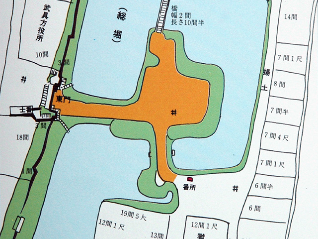 出入り口は南と北にあり、北は堀を板橋で渡り、南は土橋で渡るようになっていました。北の橋をわたって右におれると東町の通りに通じます。この通りを「下馬出し(しもうまだし)」と言いました。