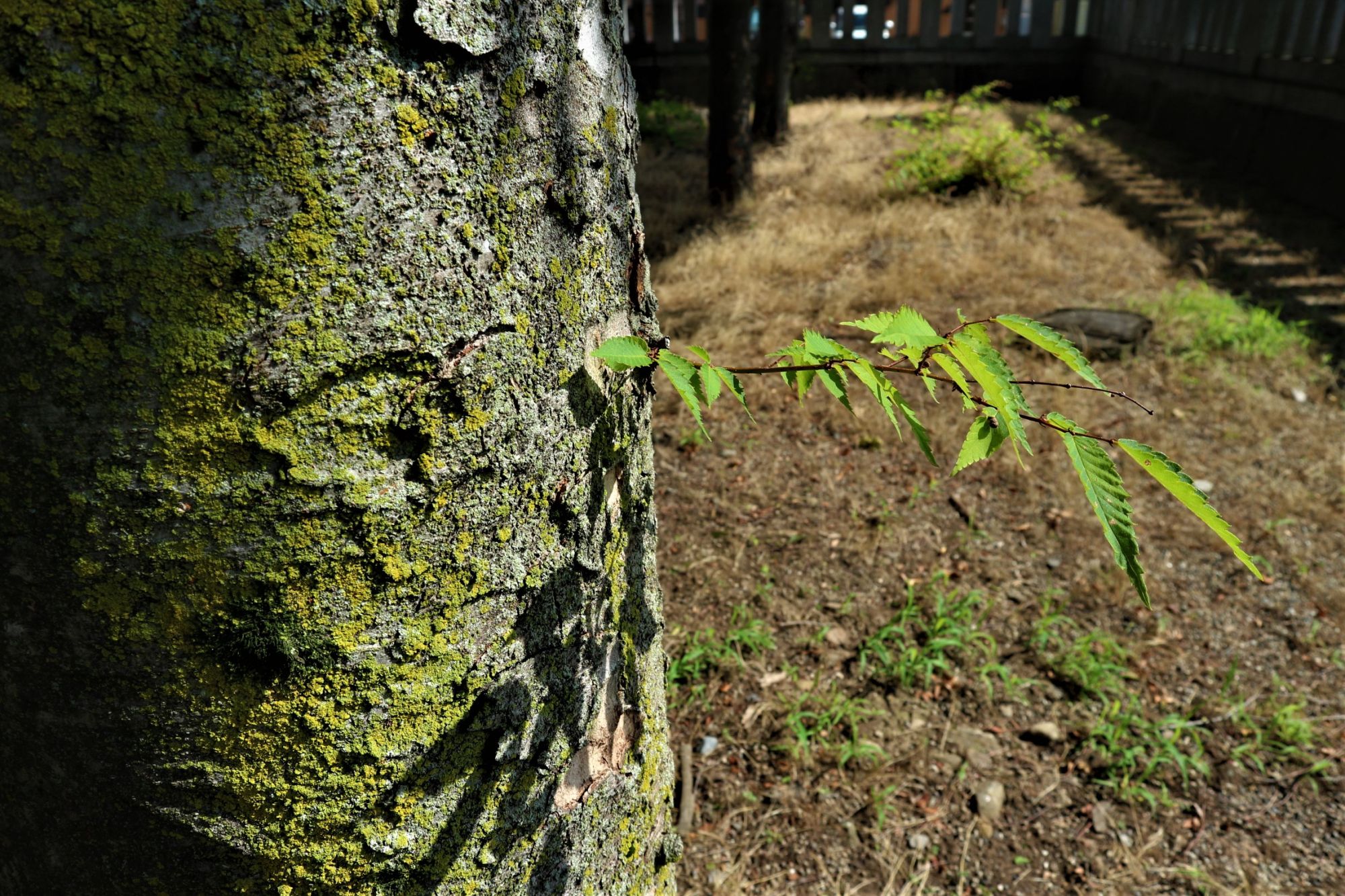 その神社の森は、近年では昭和初期に遂げた北方隣接地の拡張や植樹、そして昭和57年の境内大改修を通じ、先人の尽力によって守り育てられてきました。しかし自然は容赦なく猛威を振るい、最長樹齢の大木の芯部は、すさまじい落雷によって炭化し、今では巨大な空洞となってしまいました。その傷ついた姿でも、古木は強靭な生命力を維持し、春には新たな蕾が芽吹き、夏には青々とした新緑で境内を鬱蒼と覆い尽くします。