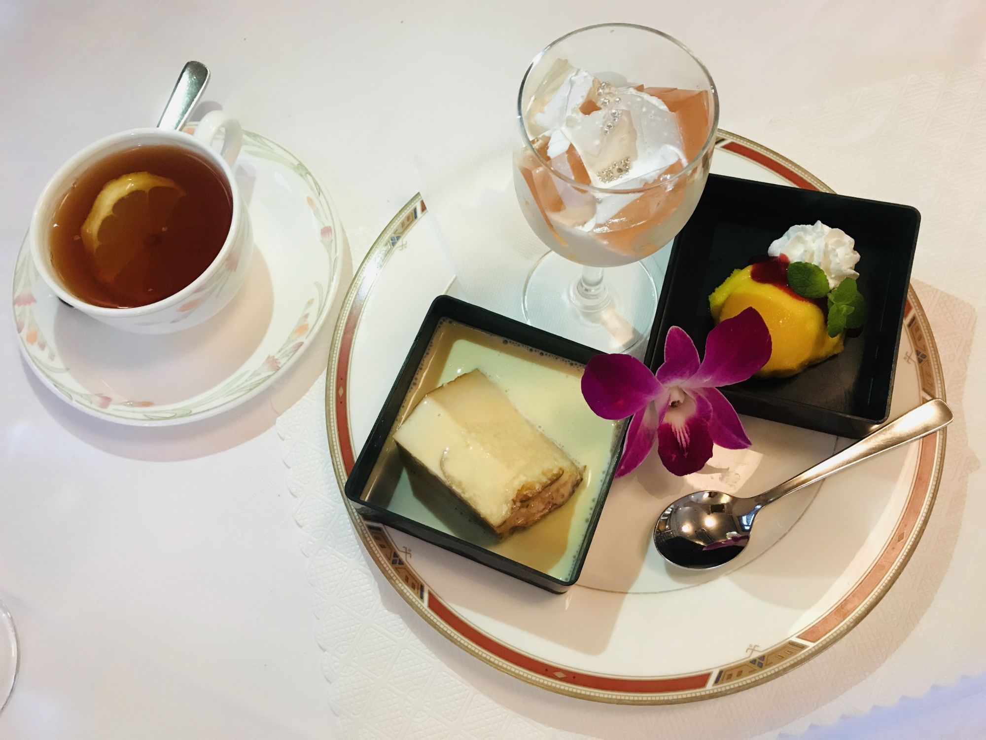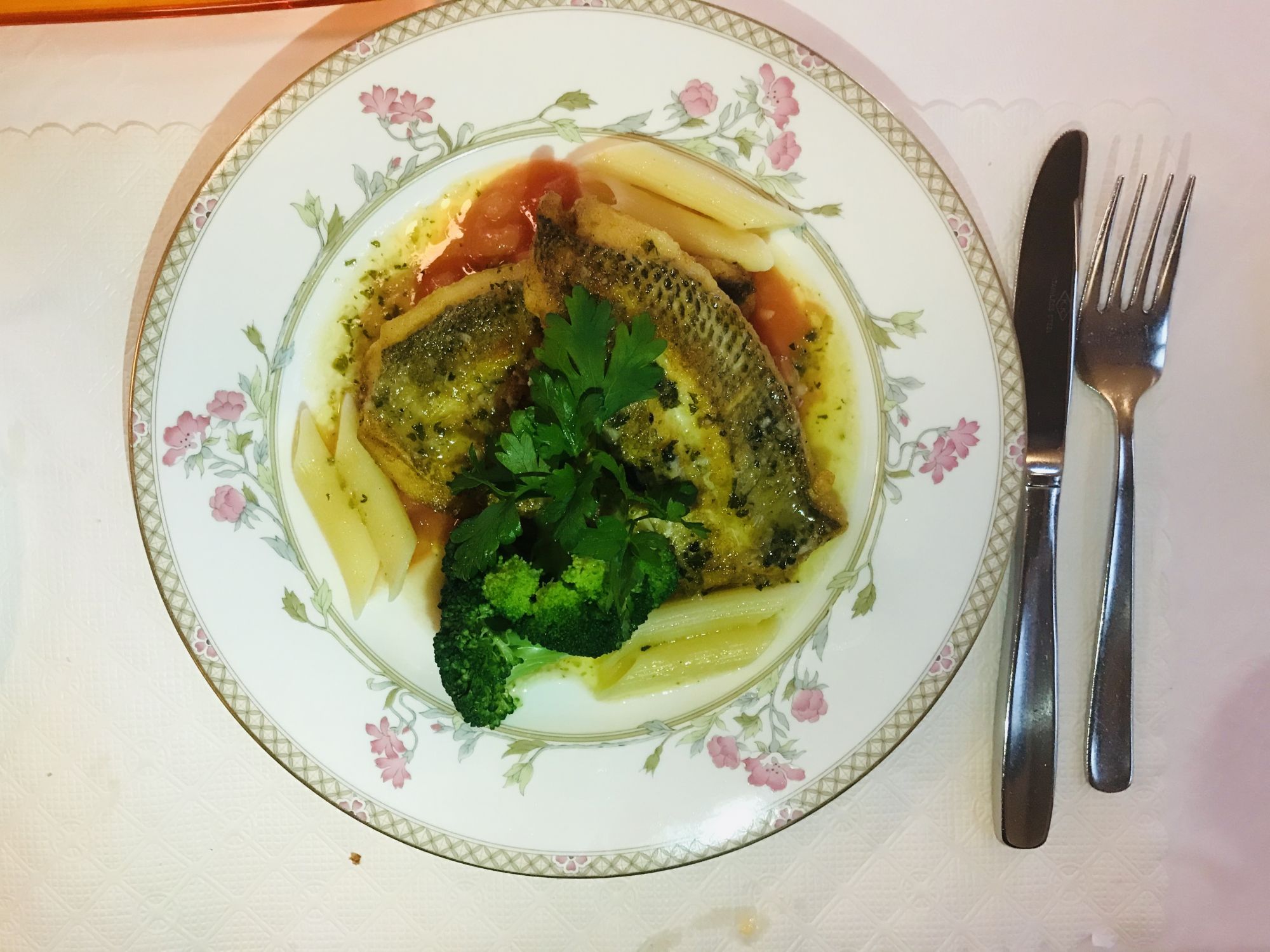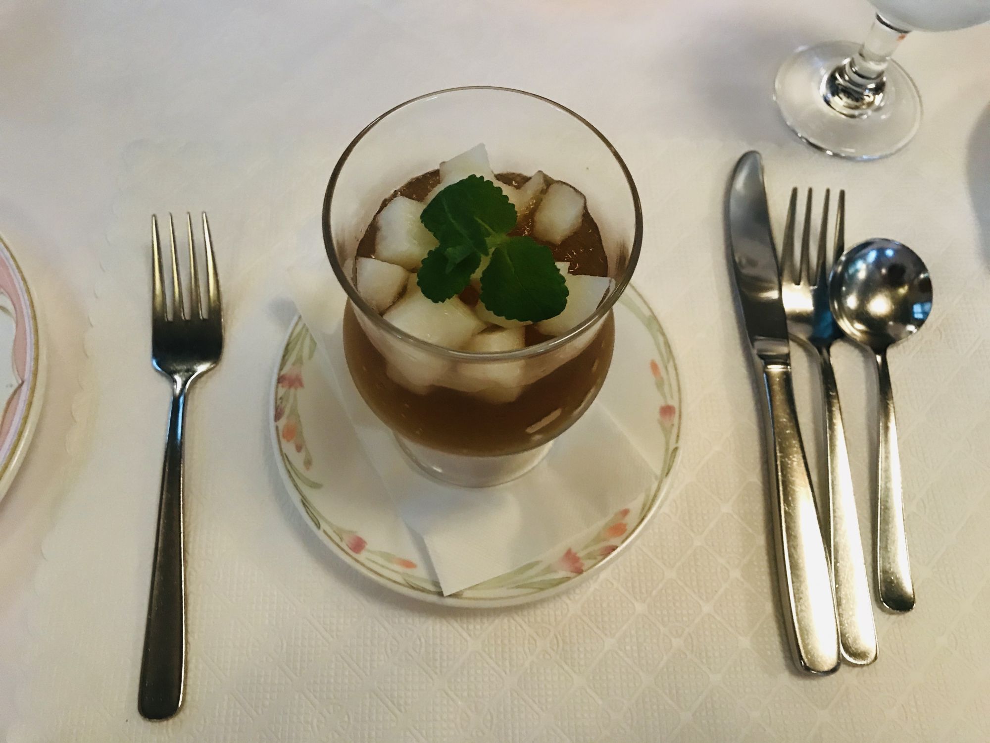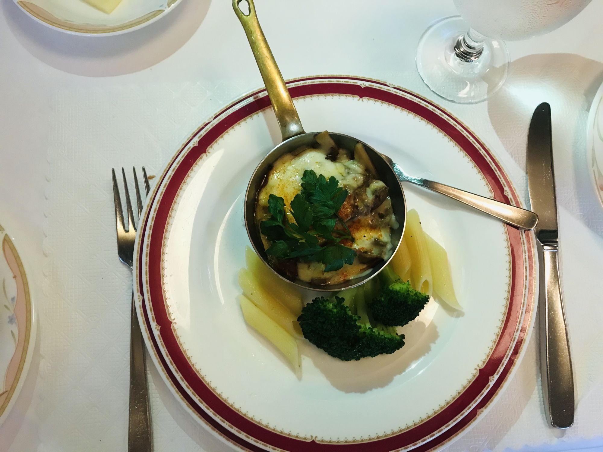 В по-летнему теплый день бульон был подан в виде желе (что очень напомнило русский холодец) с ломтиками груши. Основное блюдо – классический выбор- филе белой рыбы под лимонно-горчичным соусом или же говядина с грибами в сливках.