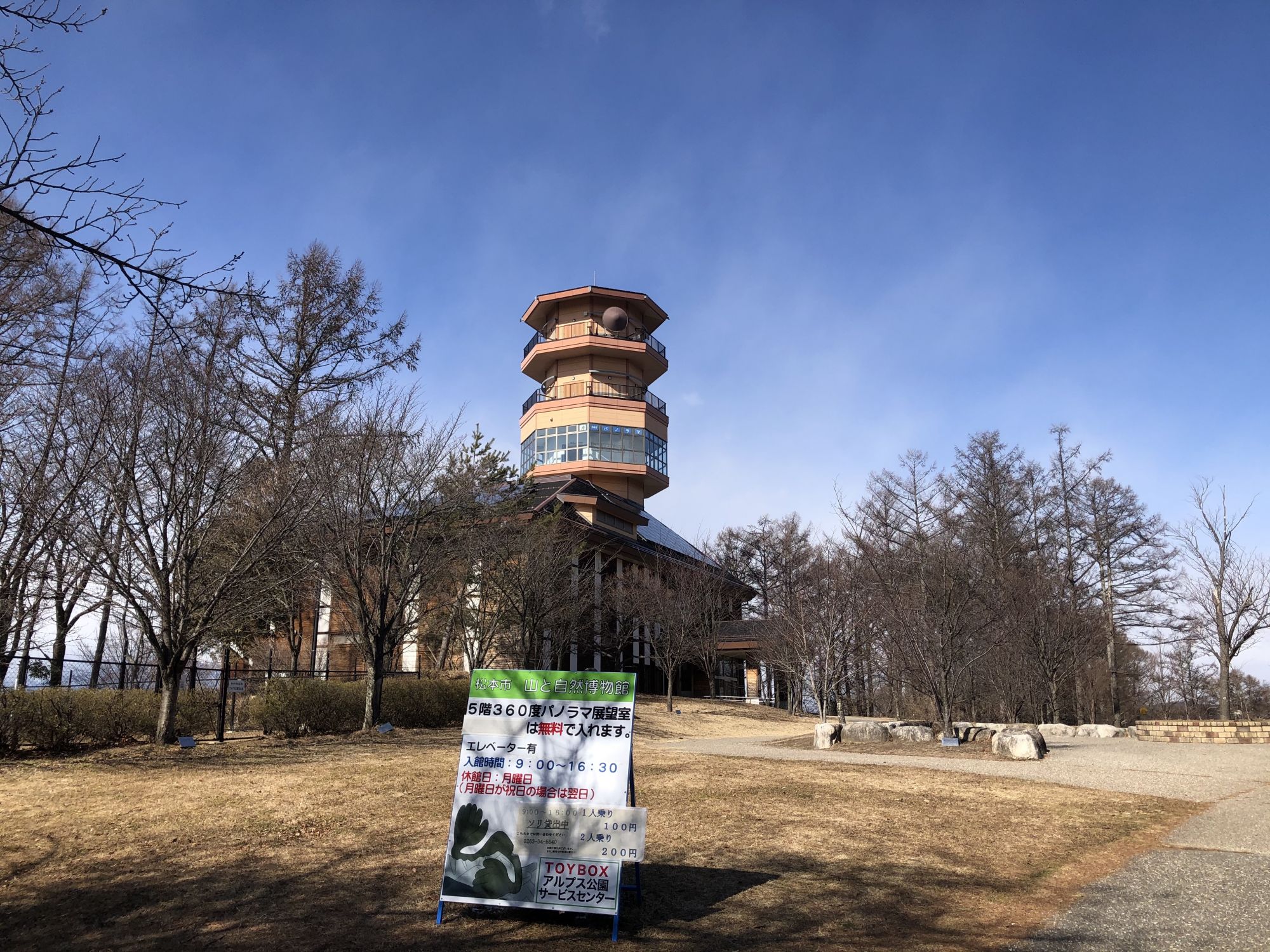 ช่วงฤดูหนาวไม่ว่าจะไปทางไหนบรรยากาศก็จะดูแห้งๆ ไม่ค่อยมีชีวิตชีวาเหมือนฤดูอื่นๆ วันนี้มีโอกาสผ่านไปแถวสวนสาธารณะแอลป์ ซากุระก็ยังไม่มีวี่แววว่าจะออกดอก เลยลองขึ้นไปชมวิวบนอาคารพิพิธภัณฑ์ภูเขาและธรรมชาติซึ่งจัดแสดงเครื่องมือ อุปกรณ์สำหรับปีนเขาในสมัยเมจิจนถึงสมัยโชวะ ตัวอย่างแมลง ฯลฯ นอกจากนี้ที่ชั้น 5 ของอาคารยังเป็นจุดชมวิวมุมสูง มองเห็นเทือกเขาแอลป์ญี่ปุ่นที่ล้อมรอบเมืองมัตสึโมโต้ทั่วทั้ง 360 องศา ปกติการเข้าไปเยี่ยมชมภายในอาคารพิพิธภัณฑ์ภูเขาและธรรมชาติจะต้องเสียค่าใช้จ่ายผู้ใหญ่ 310 เยน เด็กนักเรียนชั้นประถมเข้าชมฟรี แต่ช่วงนี้เค้าเปิดให้เข้าผู้ใหญ่เข้าชมได้ฟรีตั้งแต่ 9 โมงเช้าจนถึง 5 โมงเย็น (แต่จะต้องเข้าไปภายในอาคารก่อน 16:30 น.)