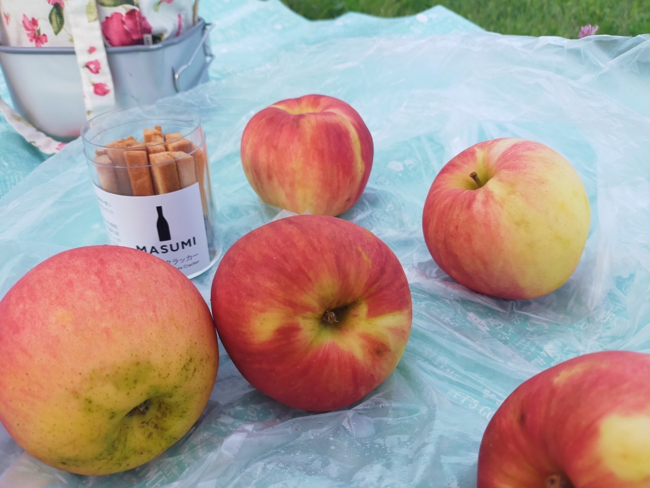 おやつには、夏のりんご「夏あかり」と山屋飴所の「堂々飴」と真澄の「酒粕クッキー」