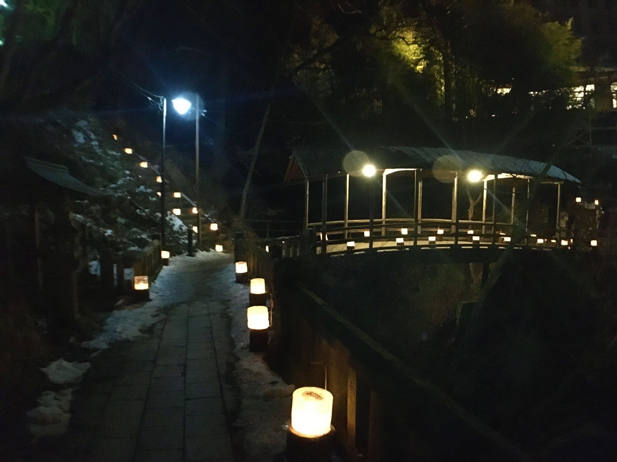 Ein Lichtermeer aus Eiskerzen in idyllischer Kulisse: Eine Holzbrücke, ein Bächlein, Tempel die golden und grün vom Hügel hinab leuchten.