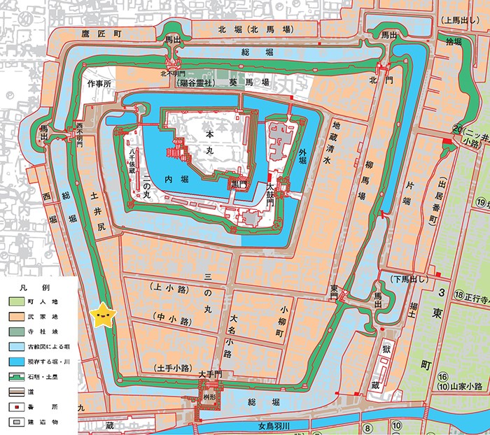 城の一番外側の総堀を掘った土を内側に盛り上げて高い土の土手を造りました。それを土塁(どるい)といいます。江戸時代には三の丸のまわりを土塁がぐるりと周っていました。