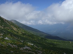 女人堂から右手は三ノ池への登山道。剣ヶ峰に行くには左手に進みます。森林限界となり展望が開けます。ハイマツやナナカマドが生い茂っているので素晴らしい紅葉が眺められるはずだったのですが、2007年は残暑が厳しく紅葉が遅れていました。この日の松本は30度を超える暑い日でした。