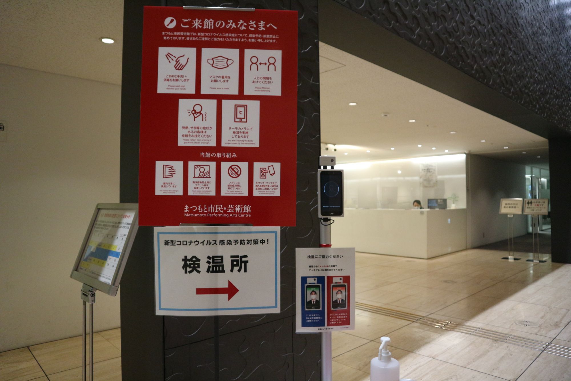 まつもと市民芸術館に入口にコロナ対策の案内と前に立つだけで自動的に検温できる機械もあります。