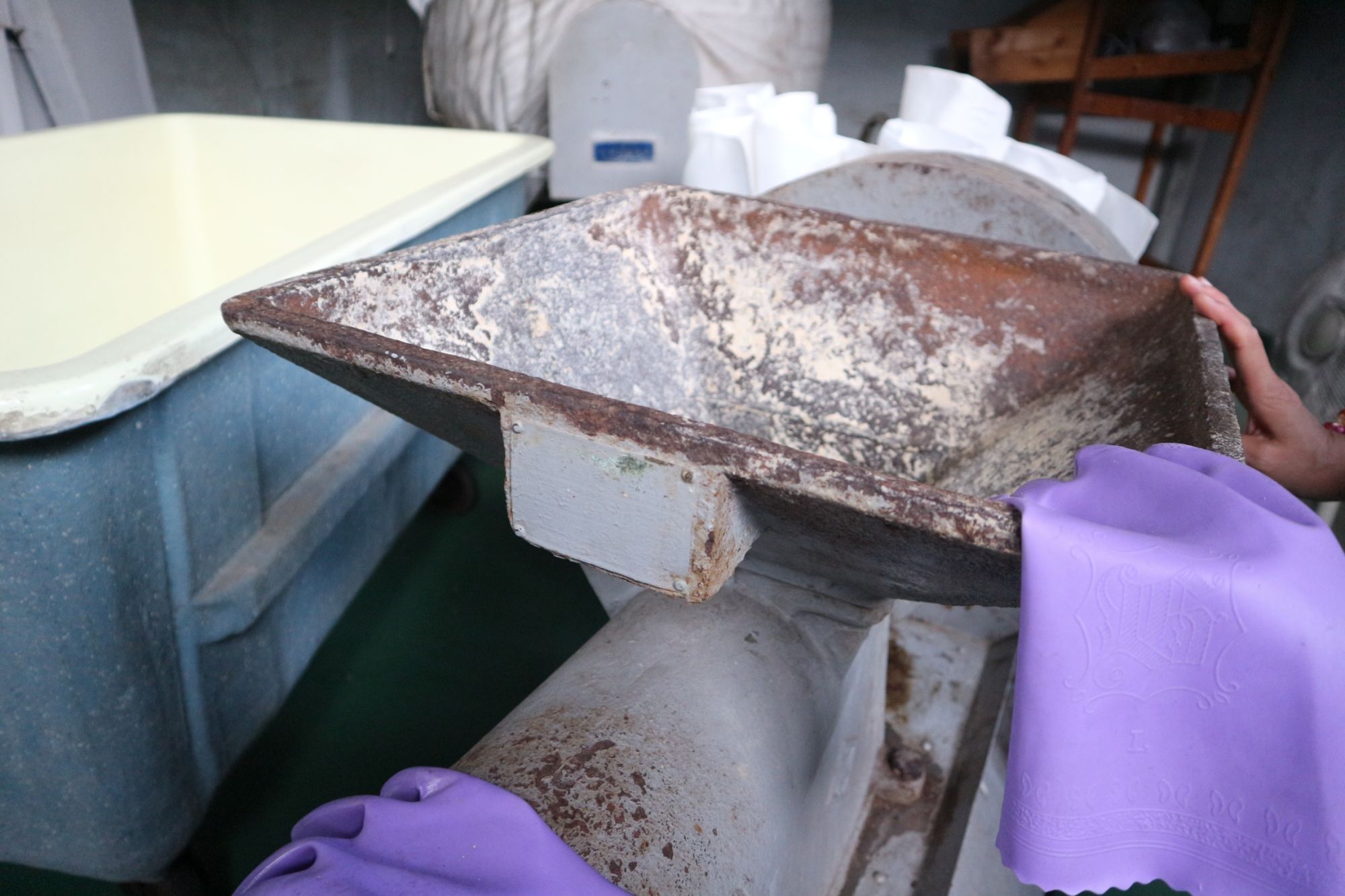 毎年味噌を仕込むのは、3月です。その時期は、アルバイトの学生さんも総出で毎日大忙しで作業に追われます。3週間ほど味噌玉を寝かし、塩を入れる前に熟成させるため生えたカビを洗い流す作業に入ります。味噌玉を砕きます。ここもまた大変力がいる作業で、とても硬くなっているので、簡単には砕けないそうです。