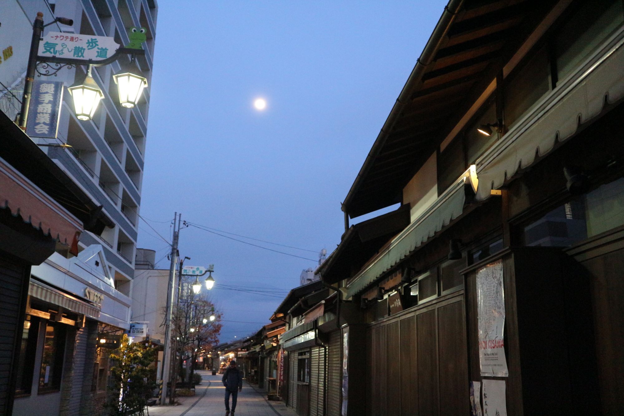 3月8日(日) 朝からみぞれ交じりの雨から曇り 夕暮れて月が昇ってきました。