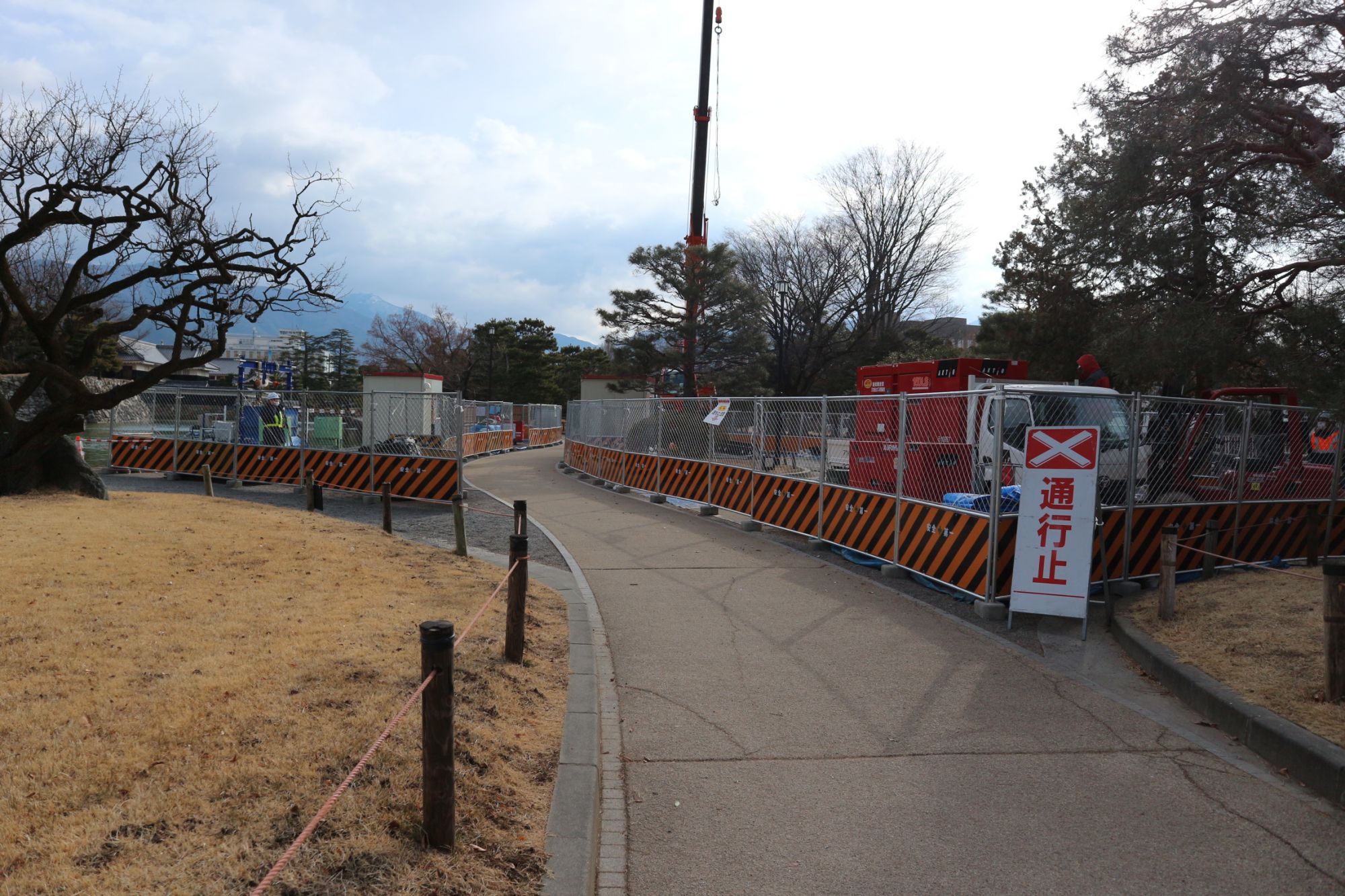 ひっそりとした松本城公園では、まだ堀の浚渫(しゅんせつ)が行われています。