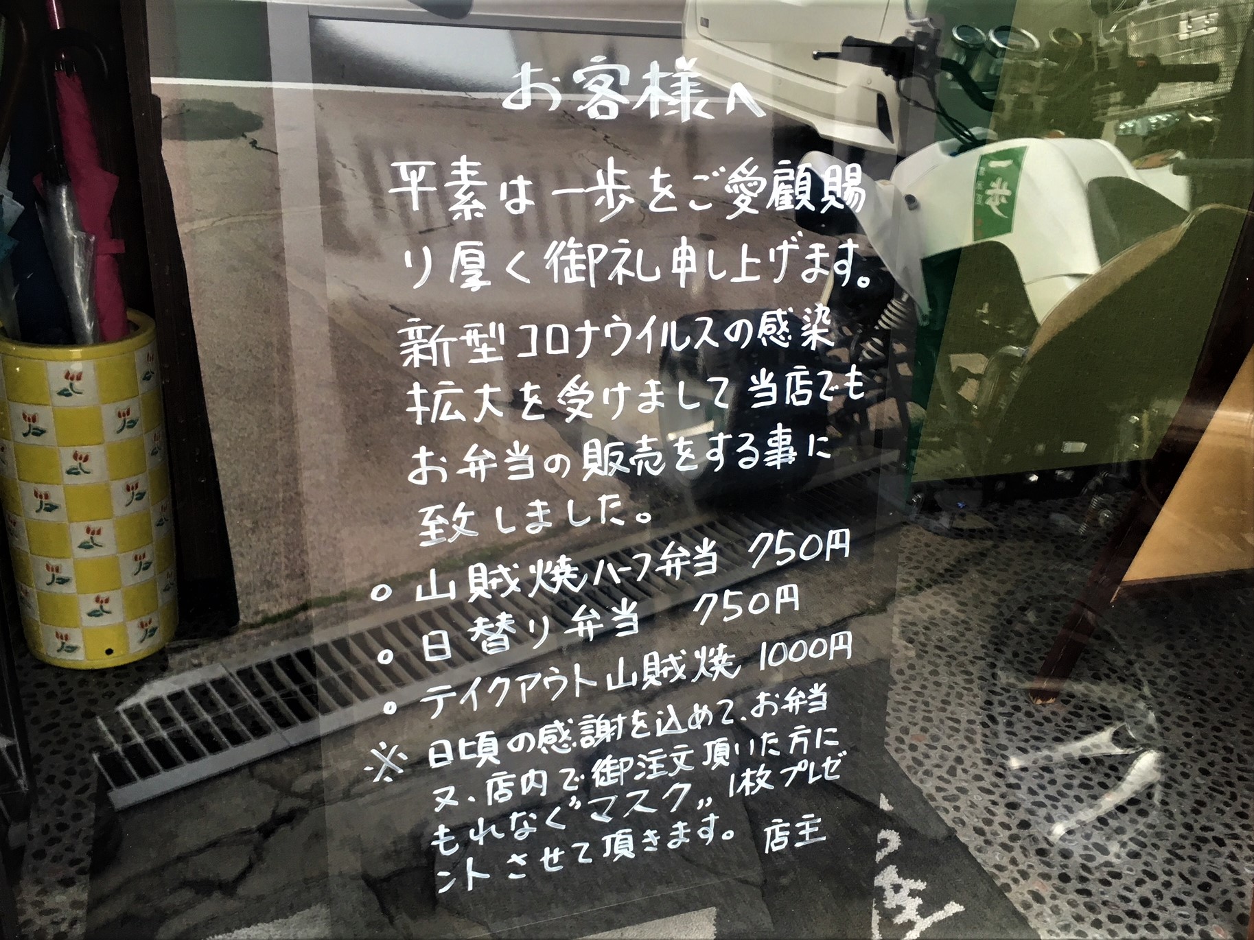 店内・またテイクアウトメニューをご注文されたお客様にマスクをプレゼントされると書かれています。