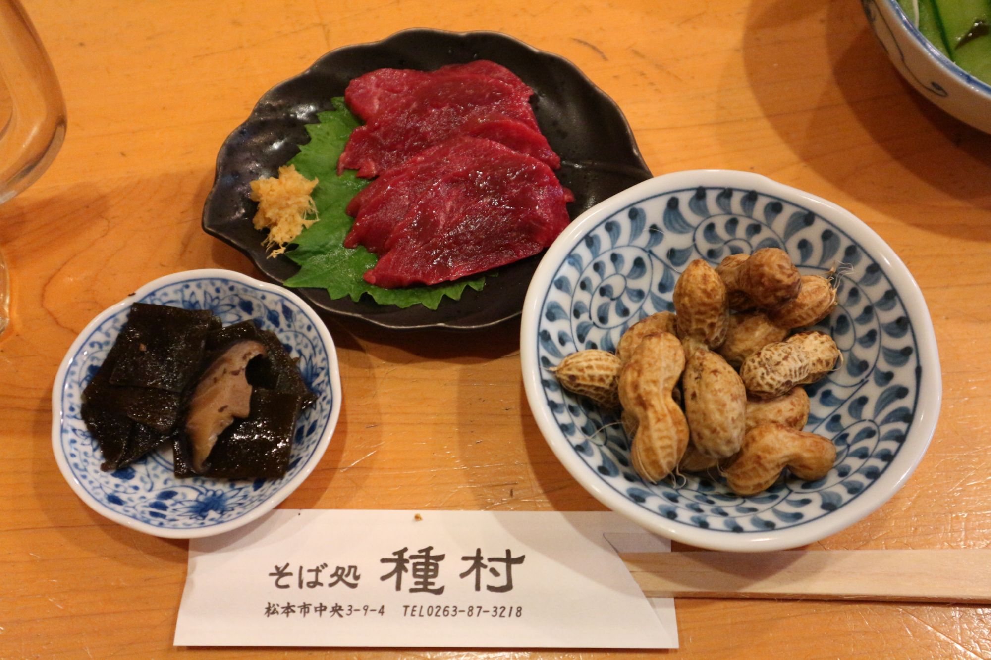 昆布と椎茸の佃煮・馬刺し・茹でピーナッツ